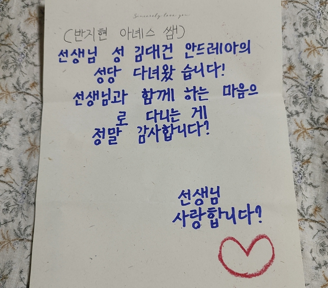 엄마의 성지순례를 내가 이어받고자 마음먹은 것, 마침 동네 성당에서 일 년에 한 번 있는 성지순례 프로그램에 참가하게 된 것, 프로그램 시작 직전에 짝꿍이 바뀌어 가장 작고 느린 친구와 짝꿍이 된 것, 처음 본 나에게 사랑한다고 말해주는 다정한 친구와 하루 내내 손을 꼭 붙잡고 다닐 수 있었던 것, 모든 것이 엄마의 선물처럼 느껴지는 하루였다. 아, 오늘 이 친구들과 함께한 미사는 내 생애 가장 시끄럽고 가장 엉망이고 가장 아름다운 미사였다.