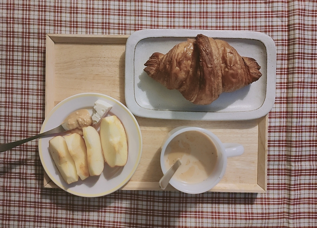 남의 아침상 준비 과정을 길게 늘어놓는 이유는, 나의 아침상 준비의 번거로움 때문이다. 회사를 다닐 때면 보통 물 한잔도 못 마시고 그대로 일어나 현관문을 박차고 뛰어나가는데, 회사로 향하는 버스나 지하철 안에서 스타벅스 사이렌 오더를 주문해 둔다. 메뉴는 늘 비슷하다. 쿨라임 피지오, 혹은 허니 자몽 블랙티. 빈속에 뭐라도 벌컥벌컥 마셔야 하루치 노동을 시작할 동력을 얻을 수 있으니까. 자의 반, 타의 반으로 한가한 요즘은 아침을 잘 차려먹는 편이다. 짜이 한 잔, 사과 한 알, 때로 버터나 치즈를 곁들이는 빵 한쪽. 이렇게 써놓으면 간단한데 이게 사실 보통 일이 아니다.