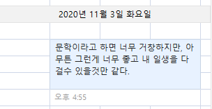 옆자리 과장님과 이런저런 이야기를 많이 나누는 편이다. 하루는 "과장님, 사는 게 즐겁지도 않고 별로 새로운 자극이 없어요"라고 메신저를 보냈더니 "하늘 아래 새로운 것 없습니다. 인생이 원래 그래요"라는 대답이 돌아왔다(그리고 덧붙이시는 말씀이 이사를 가라, 이사를 가라, 내년 되면 더 오른다, 이사를 제발 가라... 는 말씀. 역시 현명하십니다). 친구와도 비슷한 이야기를 나누게 됐는데, 친구가 했던 말은 "그러니까 개썅 마이웨이로 살아야 돼. 너도 개썅 마이웨이 해." (내가 다른 이의 삶을 가타부타할 자격은 없으나, 내가 보기에 친구가 걷는 길이 개썅 마이웨이는 아니다). 삶에 대해 부쩍 무덤덤한 태도를 취하고 있는 요즘, (주위 상황에 휘둘리지 말고) 항상 마음의 평정을 유지하라는 은사님의 가르침이 마침내 체화된 건가, 라는 생각도 해보지만 은사님이 이야기하신 것과 요즘 나의 상태와는 아예 다르다. 사람의 마음을 물이라고 한다면, 은사님은 들끓지도 얼어붙지도 말고 그저 고요히 찰랑이라고 말씀하시는 거고, 나는 어차피 마음 따위 고요하기 어려우니 아예 마음이 없는 것처럼 물을 엎지른 셈 치는 것이다. 어이쿠, 마음을 엎질러버렸네요! 그래서 전 마음이 없답니다, 하하하!