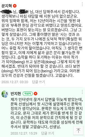 습작 시절을 어떻게 견디셨냐는 다른 수강생의 질문이 이어졌는데, 얄궂게도 그 순간 마침 인터넷이 나가버려서 수업이 끝난 뒤에야 커뮤니티에 부랴부랴 메모를 남길 수밖에 없었다. '선생님이 습작 시절을 어떻게 견디셨냐는 질문에 대한 대답을 듣지 못했는데, 간략하게라도 알려주시면 감사하겠습니다' 다정한 몇 분이 자세하게 답변을 옮겨주셨고, 마지막에 선생님의 답변이 달렸다.