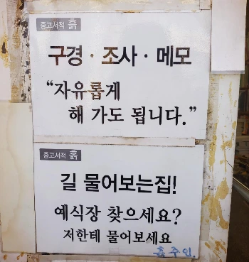 보통 점심시간엔 회사 근처 중고 서점을 기웃거린다. 중고서점보다는 헌책방이라는 말이 어울리는, 서가에 비치된 책들만큼 꼭 낡고 바랜 공간이다. 뭐라도 하나 사가겠다는 심정으로 거의 한 시간 내내 서가 이쪽저쪽을 기웃거리지만, 좀처럼 마음에 드는 책을 찾을 수 없어 빈손으로 문을 나설 때가 대부분이다. 그럴 때마다 괜히 겸연쩍은 마음이 들곤 한다. 그날도 여느 때와 같은 날이었다. 서가를 두리번거리며 이 책 저책을 뽑아 몇 장 들췄다 도로 꽂아놓기를 반복하다 점심시간이 끝날 즘이 다 되어 서점을 나섰다. 다른 것이 있다면 평소 이용하던 문과는 다른 문을 이용했다는 점인데, 서점을 나와 문득 뒤를 돌아보았을 때 내 눈에 보인 것은 문 옆 벽에 붙은 종이였다.