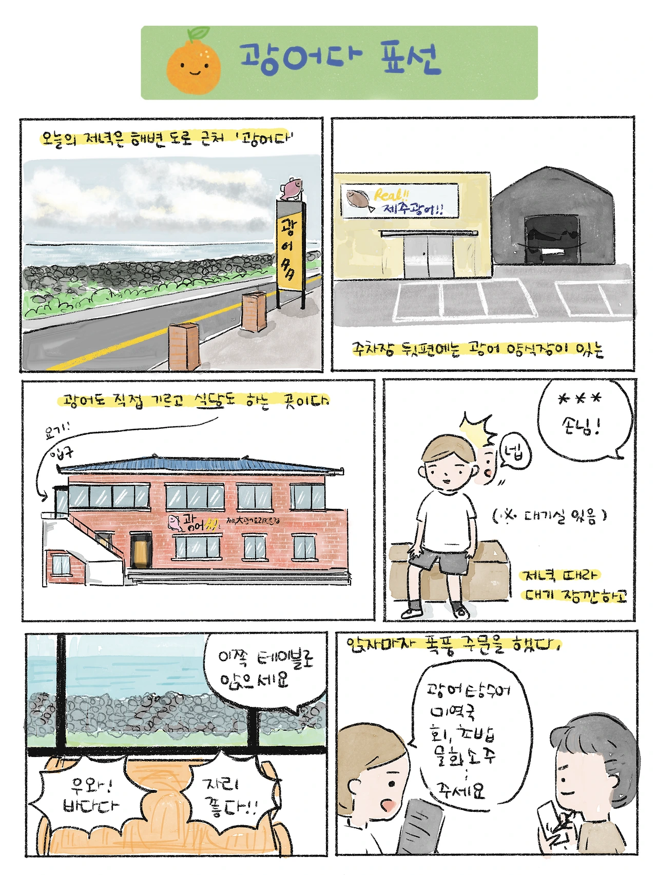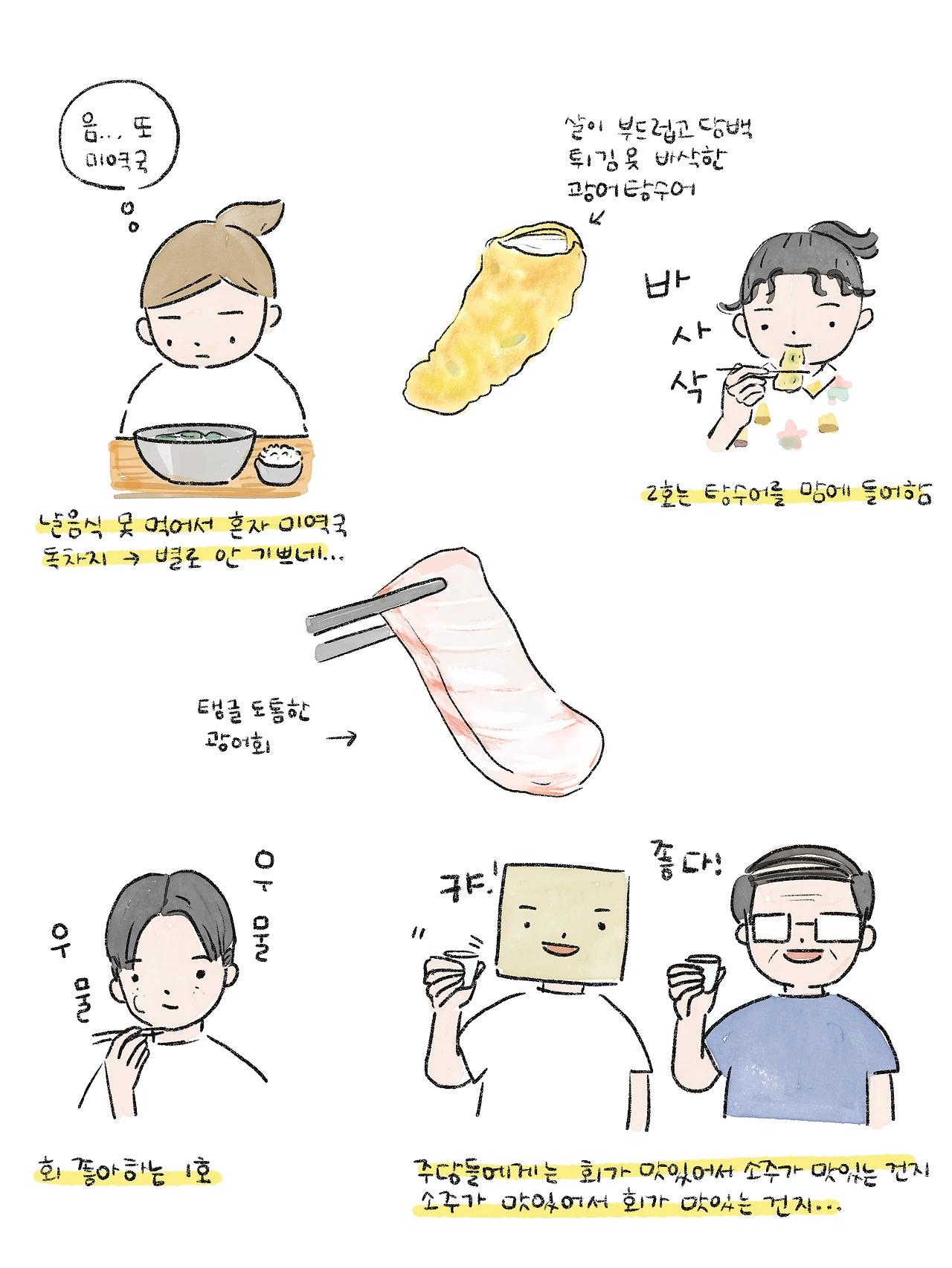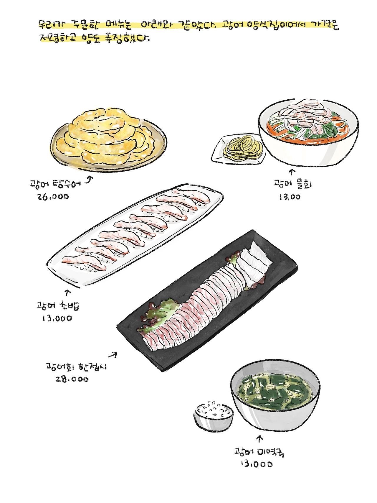 몇 년 전부터 날음식을 먹으면 두드러기가 나서 저는 회를 못 먹는데 워낙 회를 좋아하는 나머지 식구들과 함께 광어집에 갔습니다. 메인 음식을 못 먹는 자는 즐거움이 떨어지지만 나머지는 만족스러운 선택이었습니다.