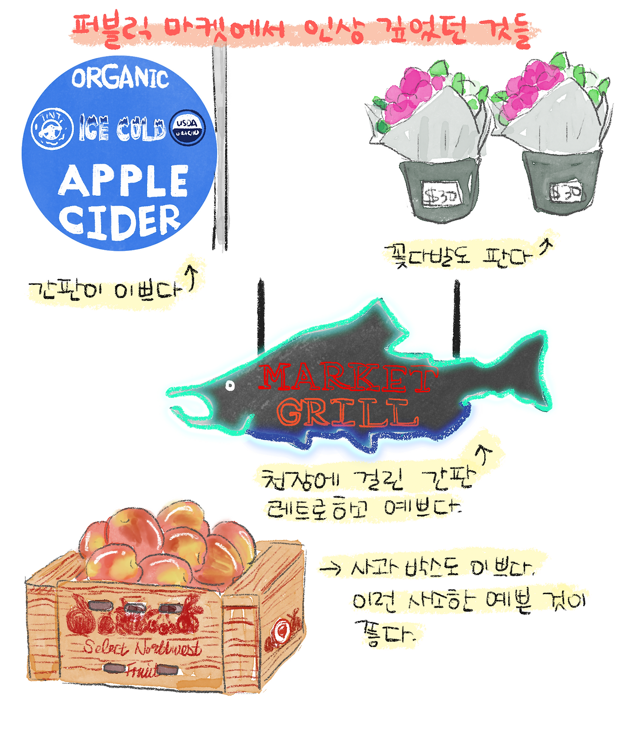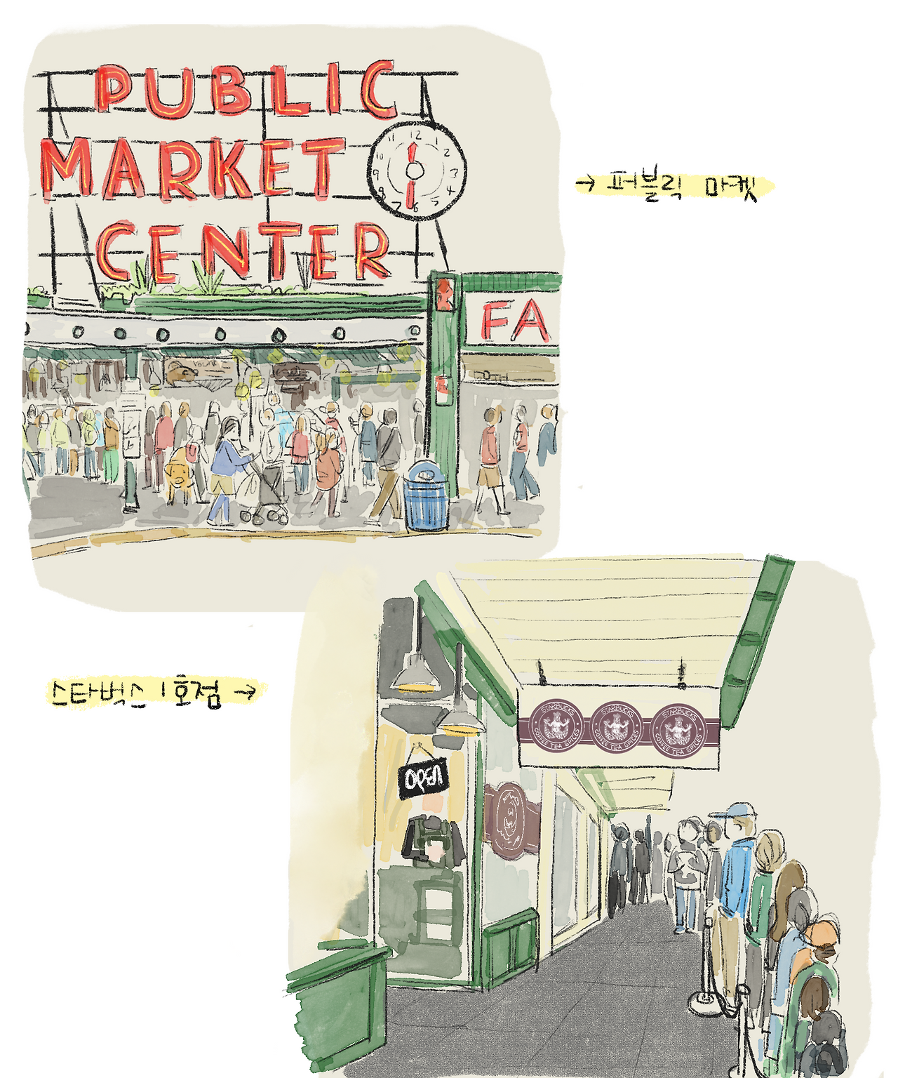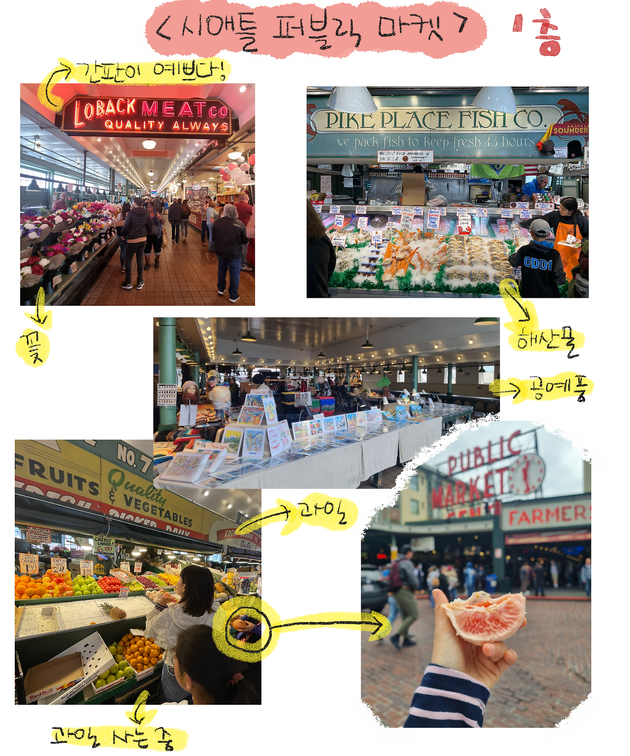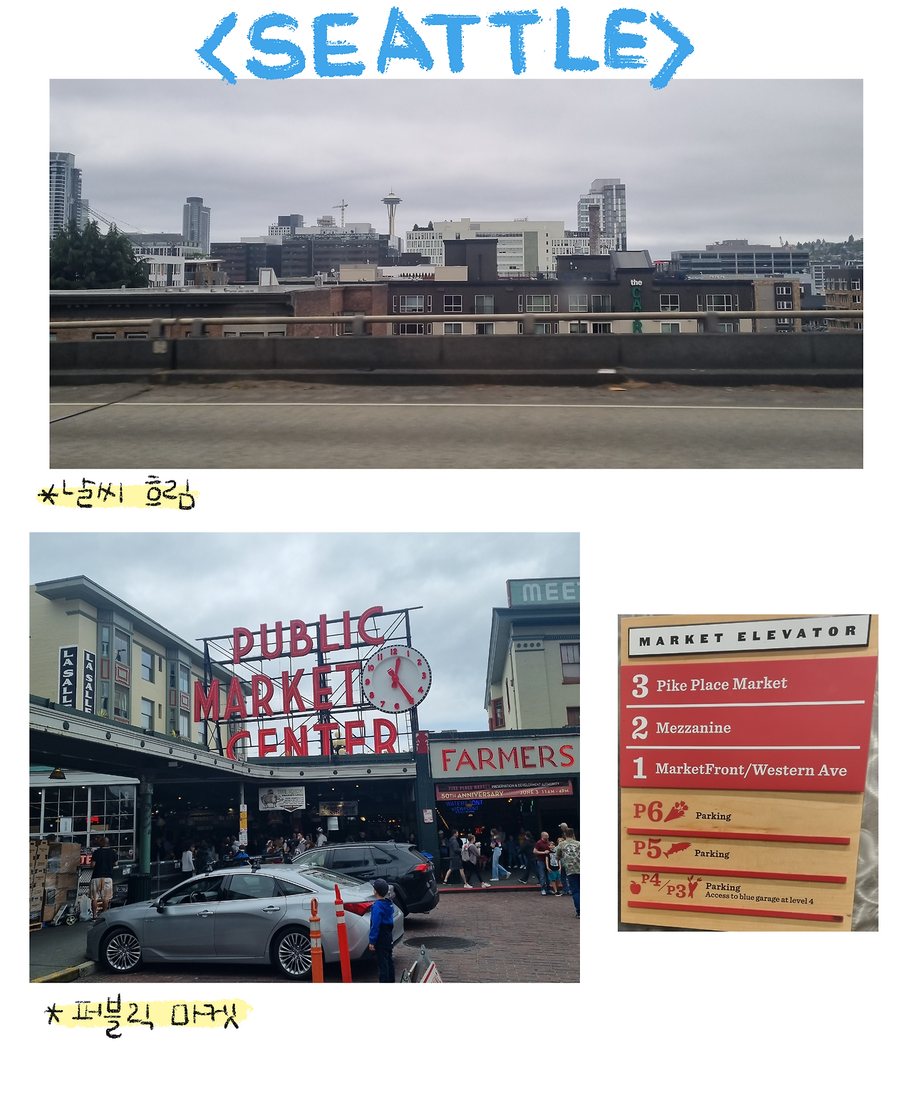시애틀에 도착하자마자 가장 유명한 '퍼블릭 마켓'으로 갔다. 퍼블릭 마켓 앞에 바로 그 유명한 '스타벅스 1호점'이 있는데 이미 가게 앞에 사람들이 진을 치고 있었다. 줄이 너무 길어서 기다릴 엄두는 나지 않아 가게 앞 로고를 배경으로 사진 중독자 아버지의 사진을 남겨드리고 마켓 안으로 들어갔다.