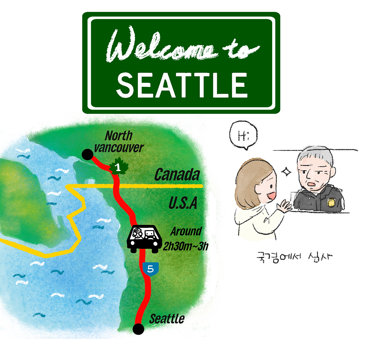 시애틀로 가는 길, 국경에서 차에서 내려 사무실로 가서 심사를 받았다. 그동안 밖에서는 차 안을 수색했다. 심사받는 동안 나는 긴장해서 습관처럼 농담을 던졌고, 네모남자는 눈살을 찌푸렸다. 어색한 분위기를 풀기 위해서 나는 농담을 섞어서 말하는데 그는 내 농담으로 대화가 길어지고 심사를 늘어지게 한다고 싫어한다. 심사를 받아서 나오면 이제 바로 미국이다.