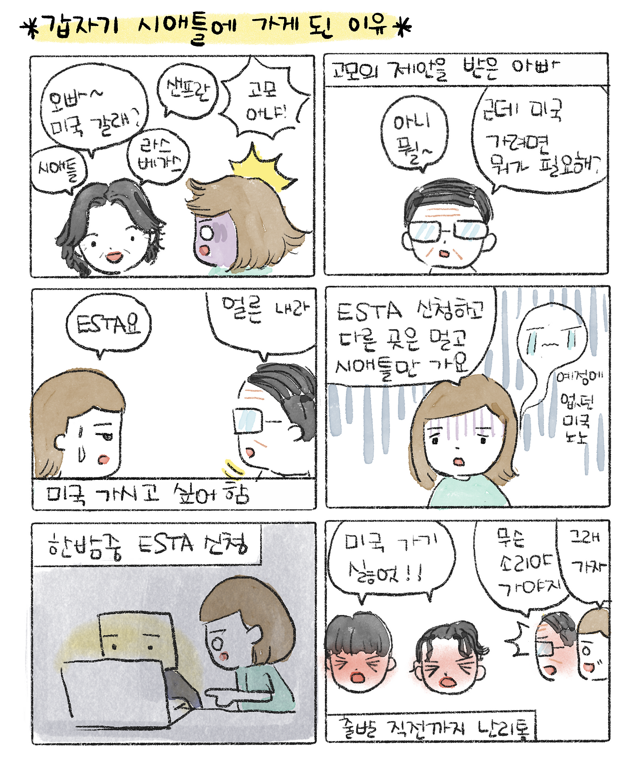 처음에는 미국은 뭘 가냐며 거절하는 척하던 아버지는 말끝을 'ESTA를 얼른 내라'로 마무리하셨다. 결국 나와 네모남자는 어쩔 수 없이 5명의 ESTA를 밤늦게까지 버벅거리며 신청했다. 밴쿠버를 떠나기 전까지 승인이 안 나길 내심 바랐지만, 눈치도 없이 단숨에 승인된 ESTA…