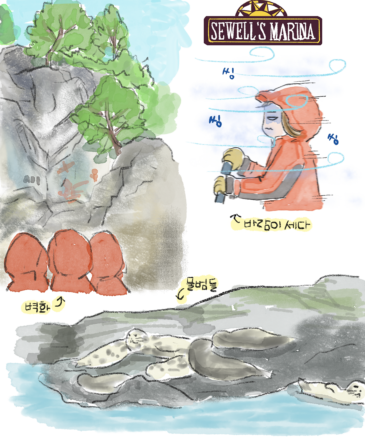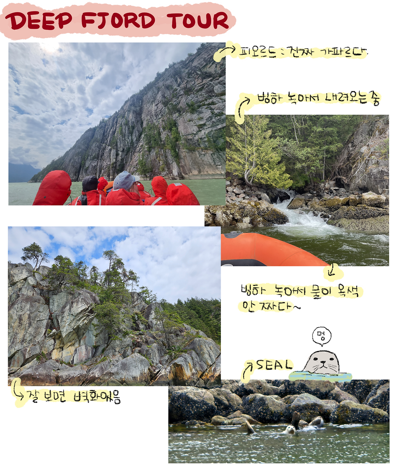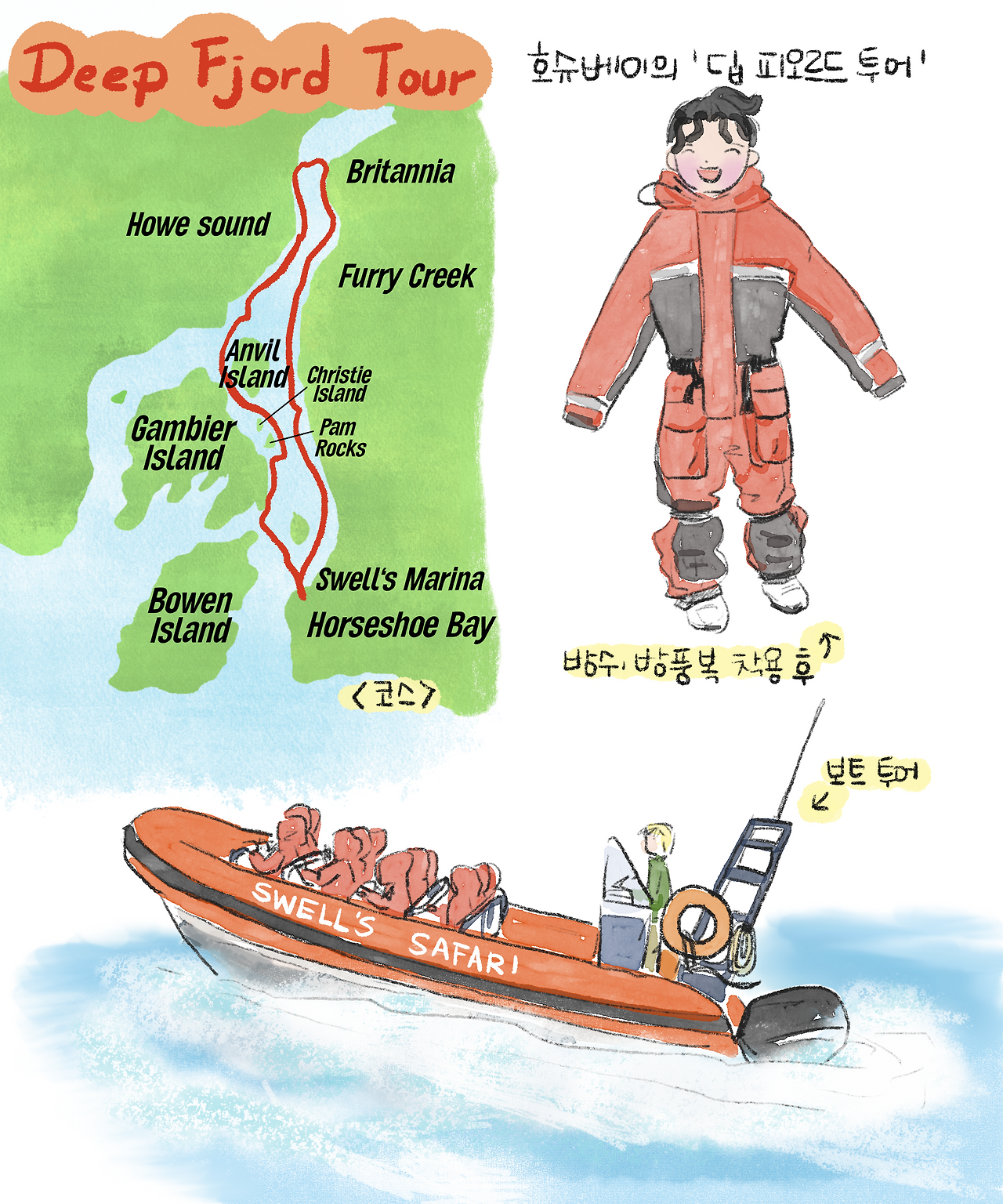 오늘은 호슈베이(Horseshoe Bay)에서 미리 신청해 둔 딥 피오르드 투어를 하는 날이다. 호슈베이에 있는 스웰스 마리나(Swells Marina)로 가서 사무실에서 서류에 사인한 후, 출발 전 간단한 설명을 들으면서 방수와 방풍 기능이 있는 옷을 입었다. 옷을 입고 나면 보트를 타고 안쪽 코스를 돌며 가이드의 설명을 듣게 된다. 전에 왔을 때 너무 재미있었기에 아빠에게 재미있을 것이라고 장담했다.