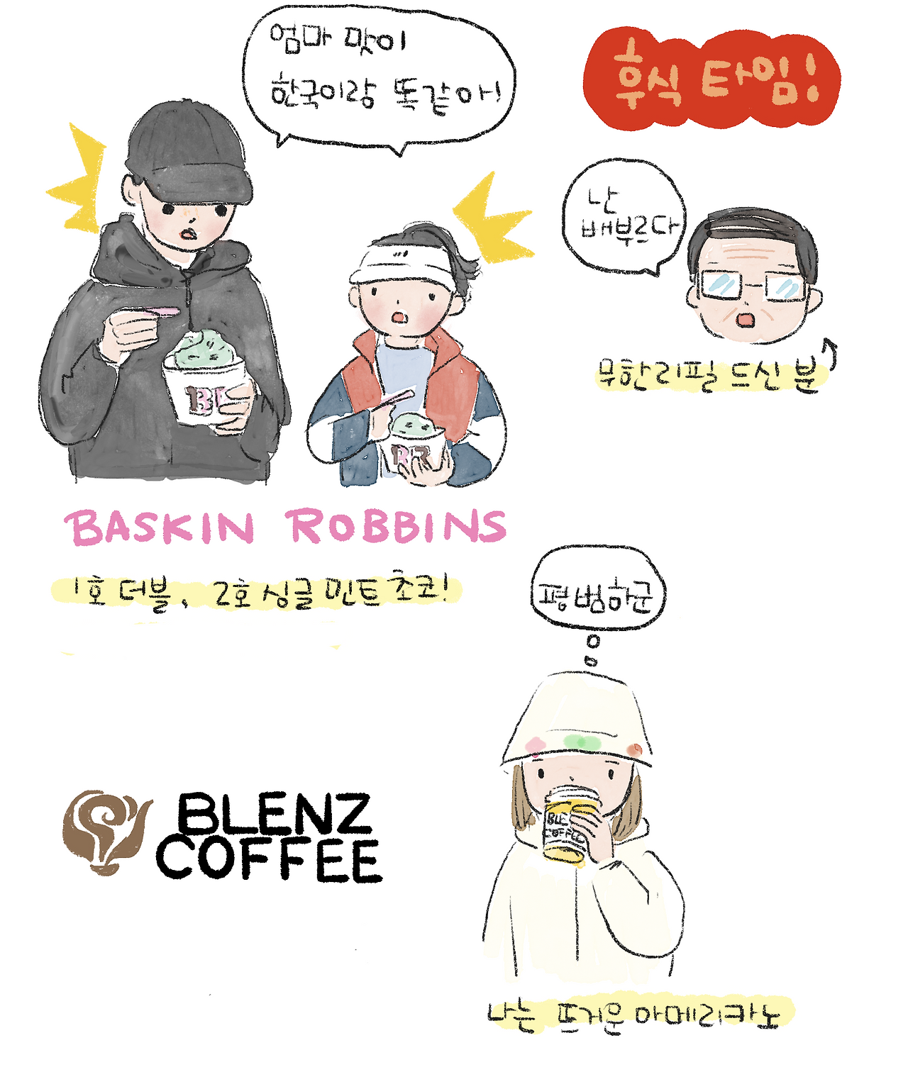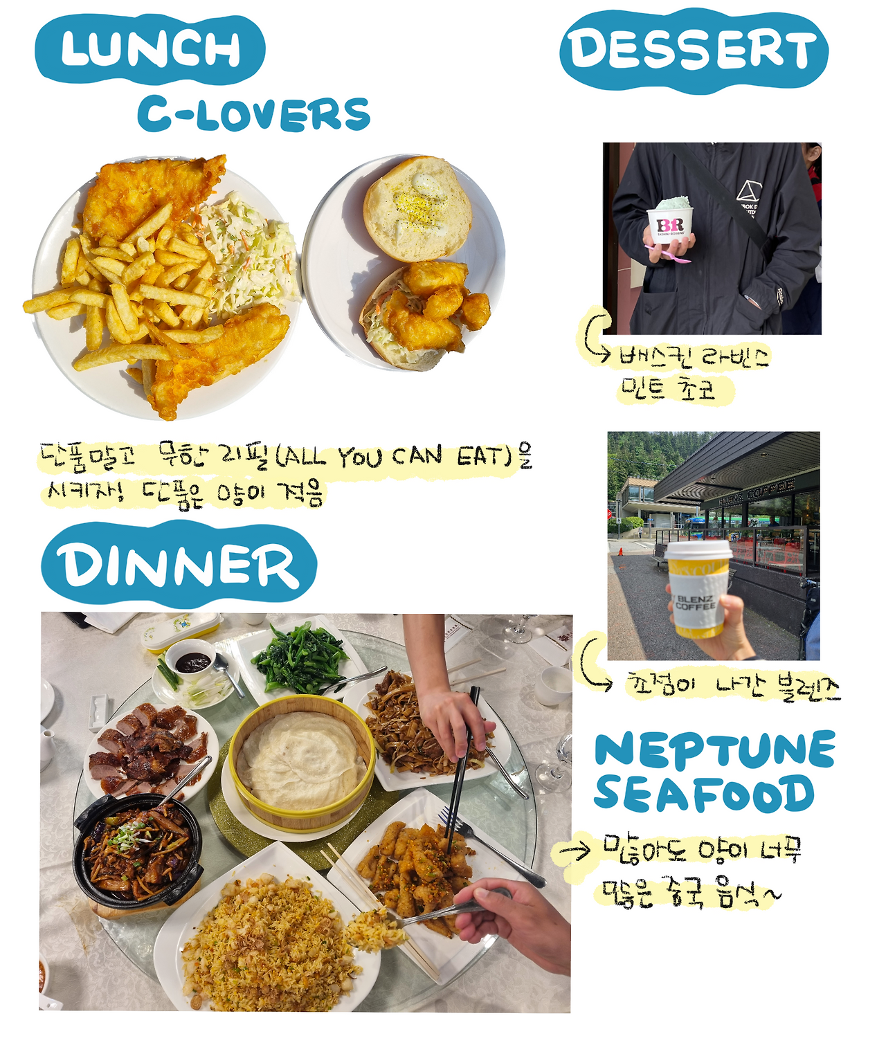 식사 후 ‘1일 1 아이스크림’ 목표를 오늘도 달성하러 바로 옆 배스킨라빈스로 향했다. 아이들은 늘 좋아하는 민트초코를 시켰고 기대했던 맛과 달리 한국과 맛이 똑같다며 신기해했다. 나는 밴쿠버에서 처음 문을 연 로컬 카페인 블렌즈 커피에서 아메리카노를 주문했지만, 맛은 그저 평범했다.
