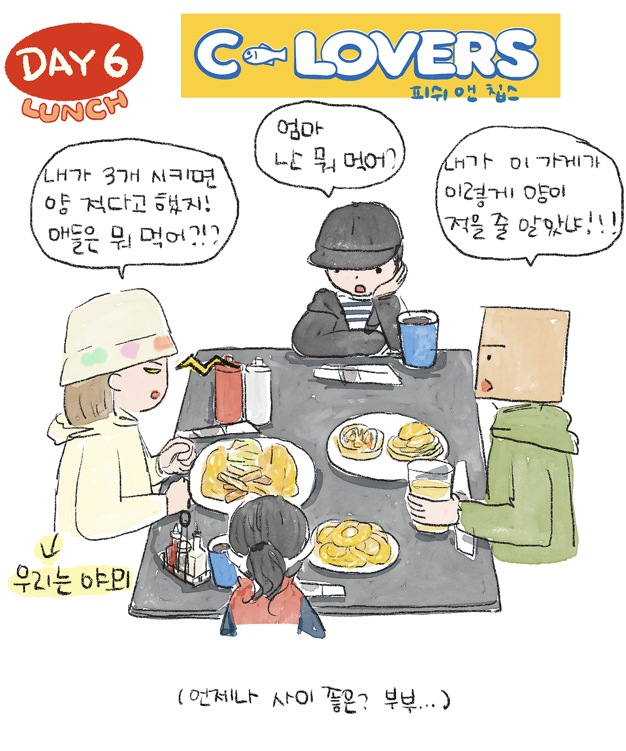 찬 바닷바람에 시달린 우리는 곧장 식당으로 향했다. 우리 가족 네 명은 햇빛이 좋은 야외 테이블에 앉았고, 고모와 고모부, 아빠, 사촌 동생은 실내 테이블에서 따로 자리를 잡았다. 평소에 음식을 넉넉하게 시키는 고모와 떨어지자, 네모남자는 캐나다는 음식의 양이 많으니 우리끼리 3개만 시키자고 강력히 주장했다. 나는 다들 지쳤기 때문에 4개를 시키자고 했지만 늘 그렇듯 나보다 고집 센 그의 의견대로 3개만 주문하게 되었다.