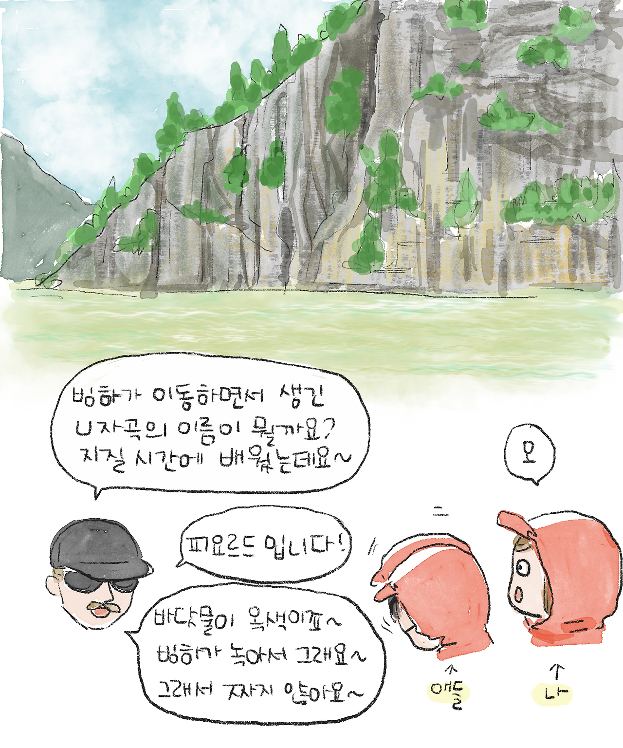 나는 차가운 바닷바람을 피해 옷깃을 여미고 손잡이를 꽉 잡느라, 초반을 제외하고는 아빠에게 내용을 통역해 줄 여유가 없었다. 아빠에게 이 투어가 재밌을 거라고 장담했지만, 차가운 바람과 가이드의 긴 설명이 아빠에게는 크게 재미있지 않았을지도 모르겠다. 그래도 돌아오는 길에 가이드가 갑자기 보트를 거칠게 몰며 놀이기구처럼 스킬을 선보이는 덕분에, 마지막엔 모두가 환호성을 지르며 마무리할 수 있었다.