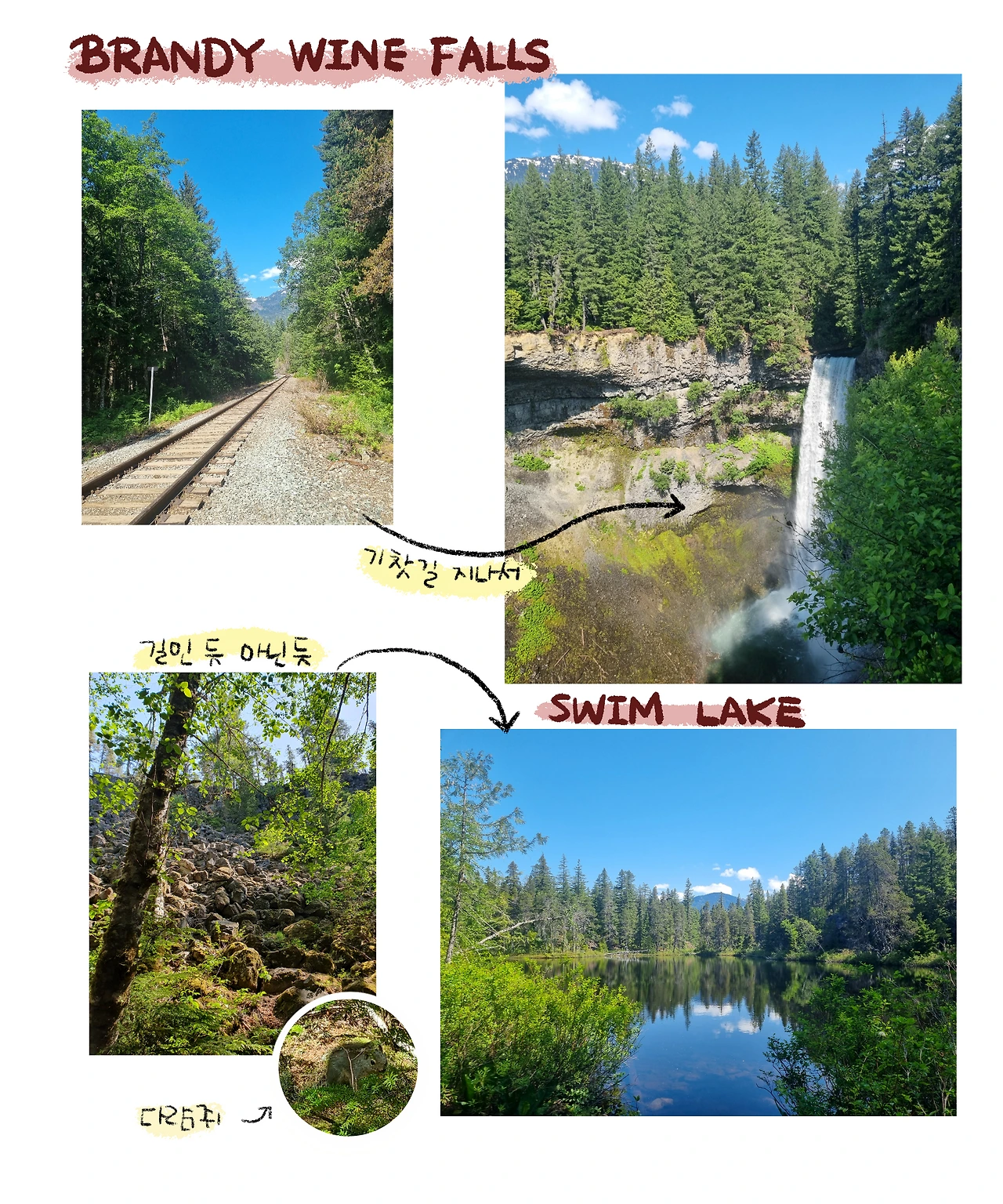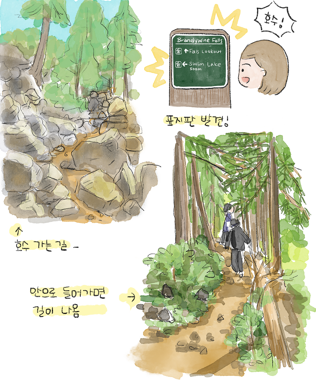 폭포를 본 후 나오는 길에 작은 이정표를 발견하고, ‘스윔 호수(Swim Lake)’로 한 번 가보기로 했다. 하지만 이번 길은 돌이 널려 있어 아예 길이라 부르기 어려운 수준이었다. 가족들은 호수를 보러 가면서도 “여기에 호수가 있을까?”라며 의심을 폭포 때처럼 하기 시작했고, 나도 스윔 호수는 처음인 데다가 주변에 가는 사람도 없어서 사실 확신은 없었다. 그래도 돌을 넘고 들어가자 어렴풋이 길처럼 보이는 곳이 나타났다. 하지만 이곳도 한국의 등산로와는 다른 느낌이었다.