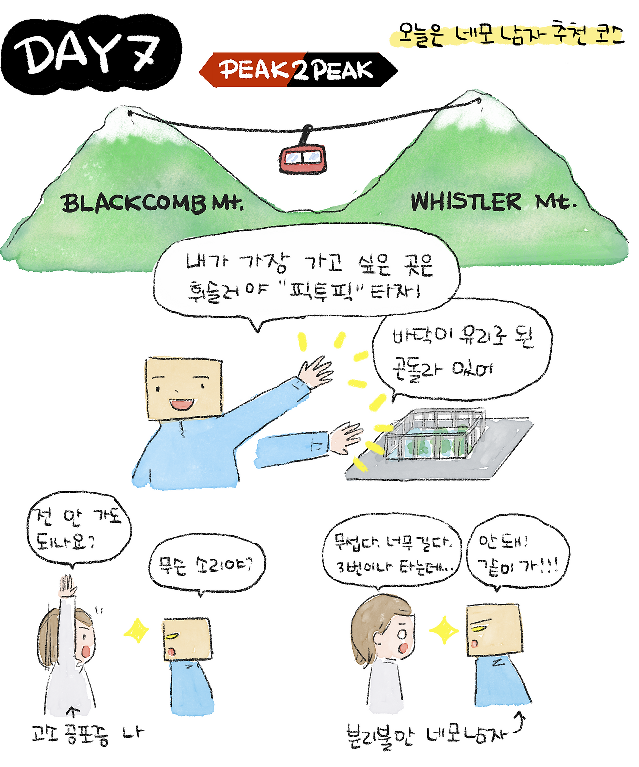 오늘 여행의 기획자는 바로 '네모남자'였다. 그가 가장 가고 싶어 했던 곳은 휘슬러의 블랙콤과 휘슬러 봉우리를 이어주는 세계에서 가장 긴 곤돌라, ‘픽투픽(Peak 2 Peak)’이다. 이 곤돌라는 무려 4.4km를 중간 지지대 없이 10분 동안 이동한다. 다른 사람들이라면 끝내준다며 타고 싶어 할 이 곤돌라는 나에게 그야말로 피하고 싶은 장소였다.