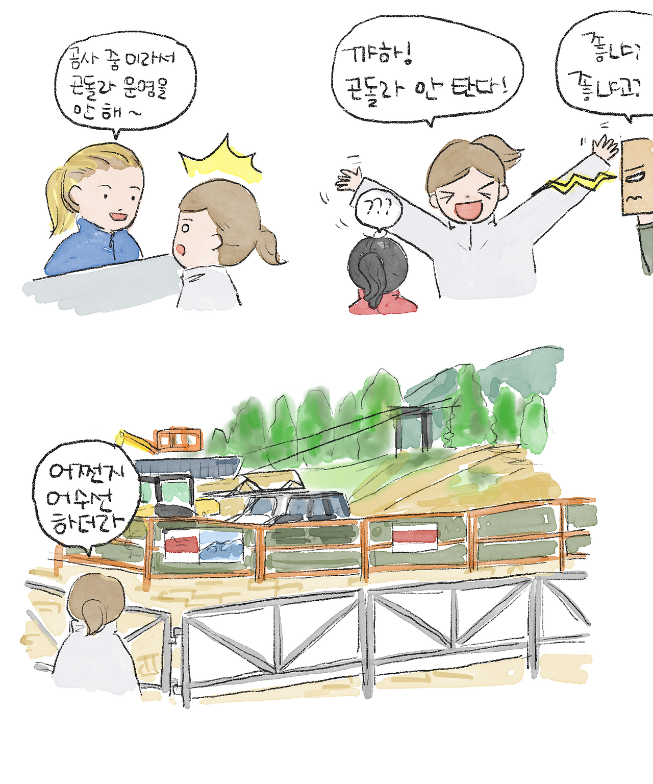 그런데 웬걸, 곤돌라는 공사 중이라 운영하지 않는다는 것이다. 나는 너무 기뻐서 다른 가족들에게 "곤돌라 공사 중이래!!!"라고 외치며 나도 모르게 엉덩이를 씰룩거리며 사무실 밖으로 나왔다. 나의 이런 반응에 네모남자는 곤돌라를 못 타게 된 것도 억울한데, 내가 너무 좋아하는 모습이 더 짜증 난다고 투덜거렸다. 그 모습을 보고 나는 속으로 '그러니까 미리 스케줄 좀 확인하지 그랬니?'라며 속삭였다. 속상해하는 네모남자는 뒤로 하고 곤돌라는 못 타게 되었으니 이왕 여기 온 김에 점심이나 하고 가자고 얘기했다.