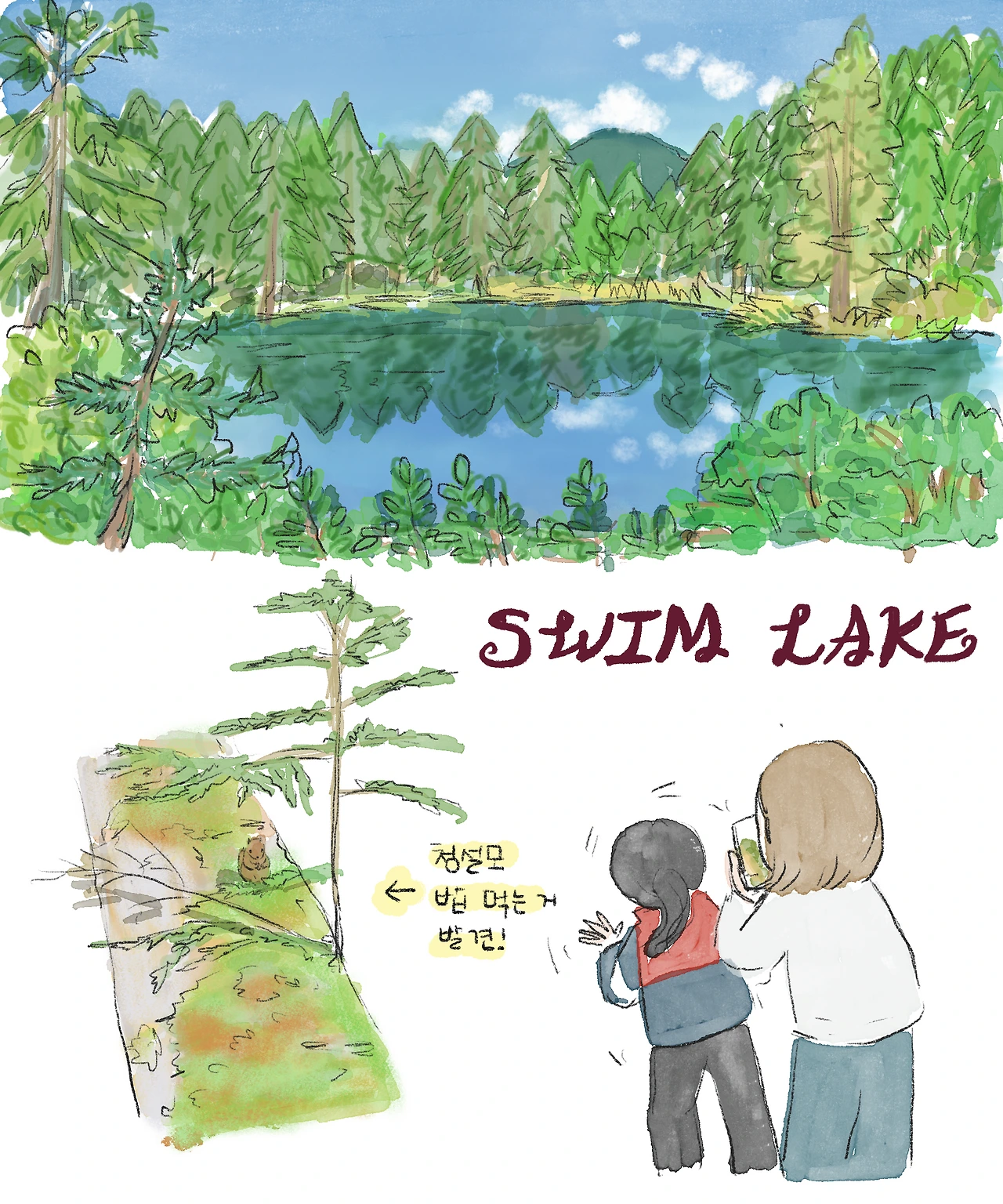 그리고 정말로 호수가 나타났다. 캐나다는 대자연의 나라인 만큼, 트레일을 하다 보면 곳곳에서 호수나 폭포를 알리는 이정표를 쉽게 볼 수 있다. 호기심에 그 이정표를 따라 걷다 보면 길 같지 않은 길이 이어져 의심이 들기도 하지만, 결국 이정표가 가리키던 호수나 폭포가 갑자기 모습을 드러낸다. “정말 있는 거야?”라고 불평하다가 마주하는 자연은 언제나 아름다움으로 사람을 압도한다. 이 호수의 이름은 스윔 레이크(Swim Lake)인데, 고요하게 둘러싼 나무들 덕분에 수영하러 들어가면 다시는 나오지 못할 것 같은 신비로운 느낌이 들었다.
