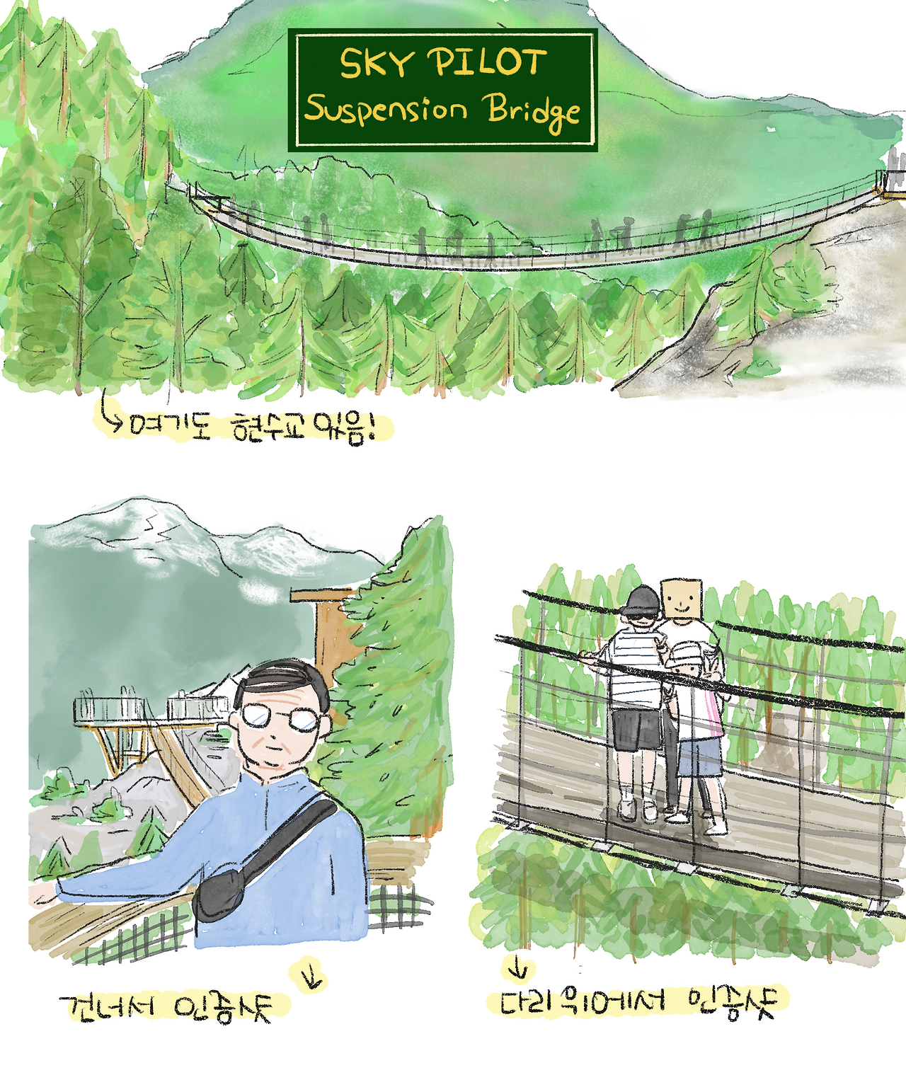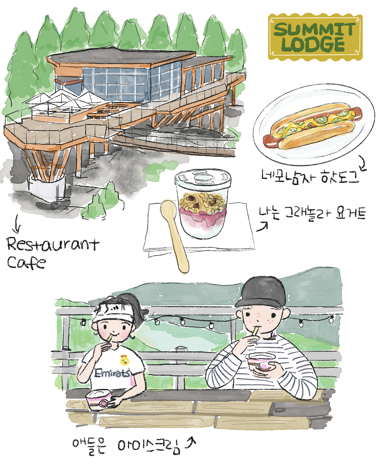 씨 투 스카이를 타고 올라가면 ‘스카이 파일럿 현수교(Sky Pilot Suspension Bridge)’와 ‘서밋 로지(Summit Lodge)’가 있다. 다른 가족들이 현수교를 왕복하는 동안, 나는 서밋 로지에 앉아 바다를 바라보며 간식을 즐겼다. 이곳에서 먹는 햄버거나 핫도그 같은 그릴 메뉴는 육즙이 가득해 특히 맛있다. 인생에서 가장 맛있는 닭가슴살 햄버거도 여기서 먹었을 정도다. 하지만 이번에는 점심을 먹고 온 터라, 핫도그 하나와 그래놀라를 주문하고 아빠와 아이들에겐 아이스크림을 시켜주었다. 이곳에서도 주문하느라 바빴지만, 고요한 풍경 덕분에 마음이 한결 평화로워졌다. 그래, 언제 또 내가 이렇게 쓰임이 있겠나 싶었다.