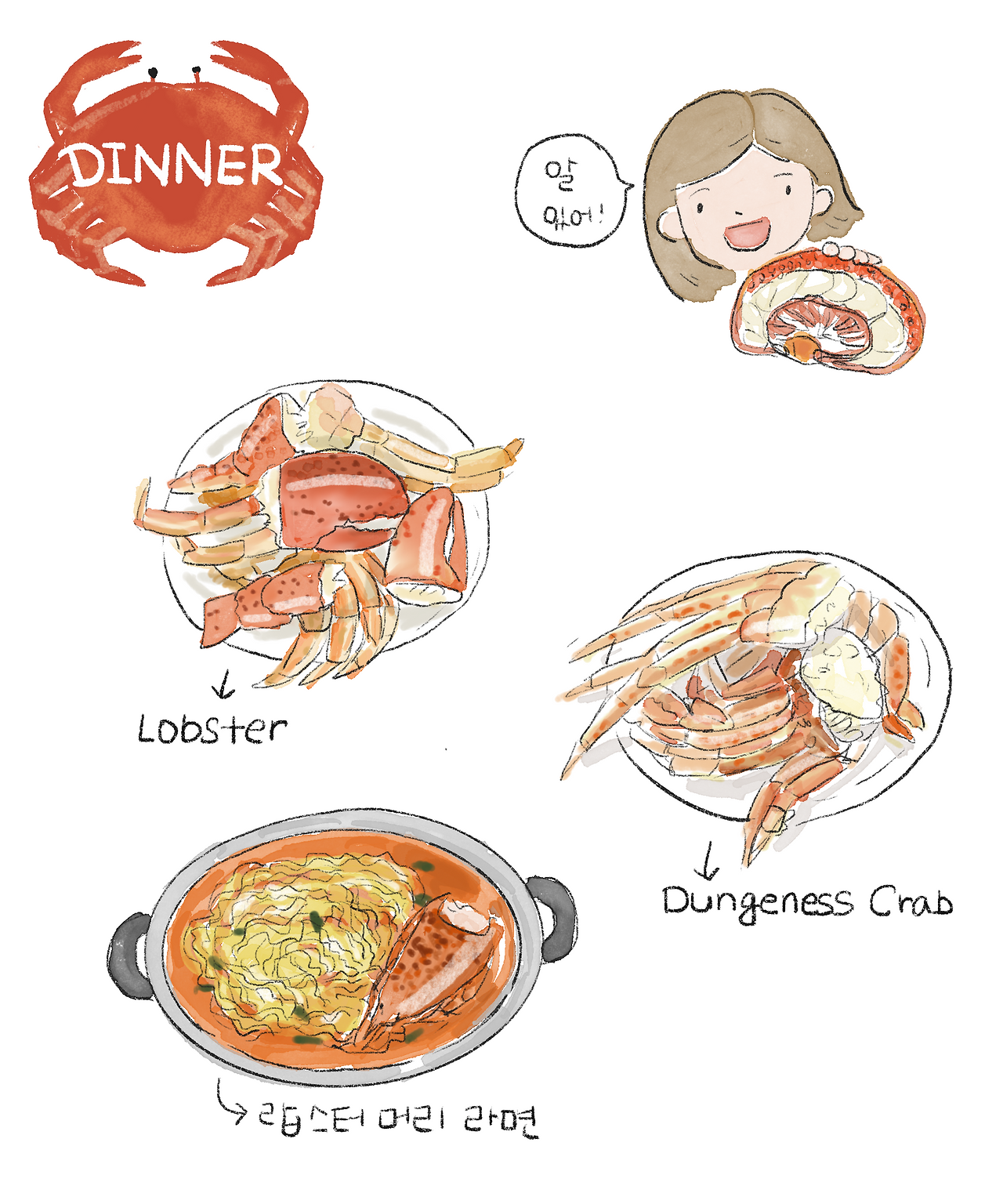 오늘 저녁은 캐나다에 오면 꼭 먹어야 한다는 랍스터와, 시애틀 여행 때 인기였던 던지니스 게로 정했다. 삶은 랍스터와 게를 사 와서 집에서 먹었는데, 집에서 먹으면 뒷정리는 귀찮지만 식당에서의 나만 주문하고 챙기기 바쁜 부산스러움은 없다는 것이 장점이다. 도돌이표 주문이 진이 빠지지만 사실 나는 연어 스테이크를 먹으러 레스토랑에 가고 싶었다. 그러나 아빠와 고모부에게 하루에 두 번 양식은 무리일 것 같았다. 물론 랍스터도 양식이지만, 라면에 넣어 먹었으니 이건 퓨전이라고 해야겠지?