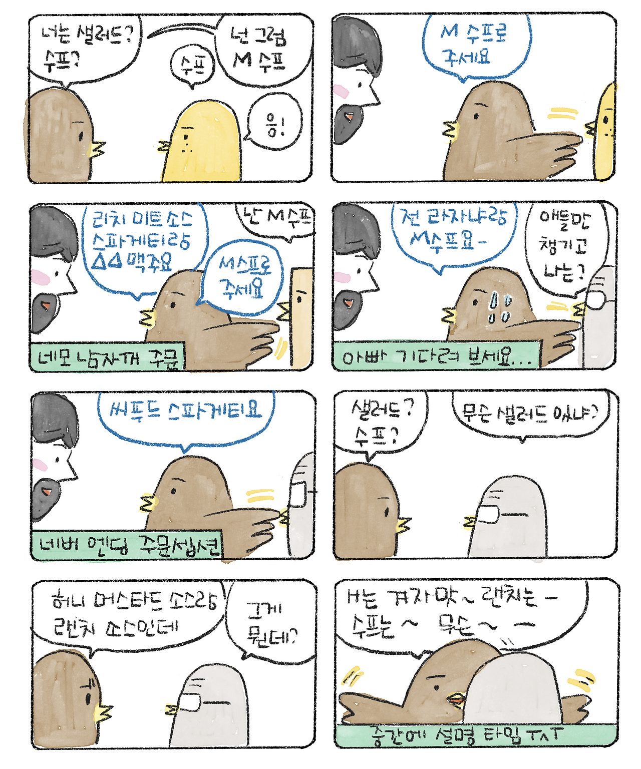 아이들은 메뉴를 읽지 못해 아예 포기 상태라 내가 대신 메뉴를 봐야 하고, 아빠는 메뉴를 읽어볼 생각조차 없으셨다. 그나마 네모남자는 스스로 메뉴를 보고 먹을 것을 정해둔다. 주문하는 동안 아빠는 "도대체 언제 자기 것 주문하냐"며 계속 끼어들지만, 샐러드나 수프 같은 옵션은 미리 생각하지 않아 결국 하나씩 일일이 설명을 해드려야 했다. 다섯 명의 주문을 끝내고 나면 정신이 하나도 없었다.