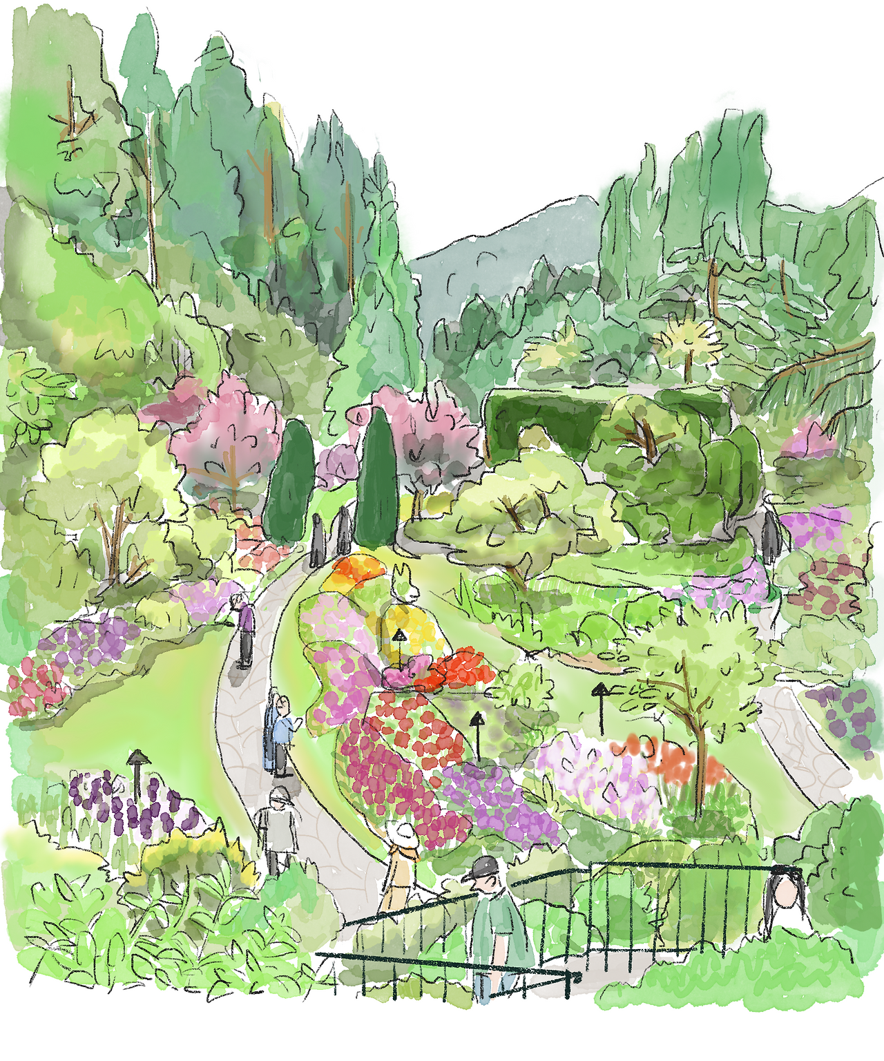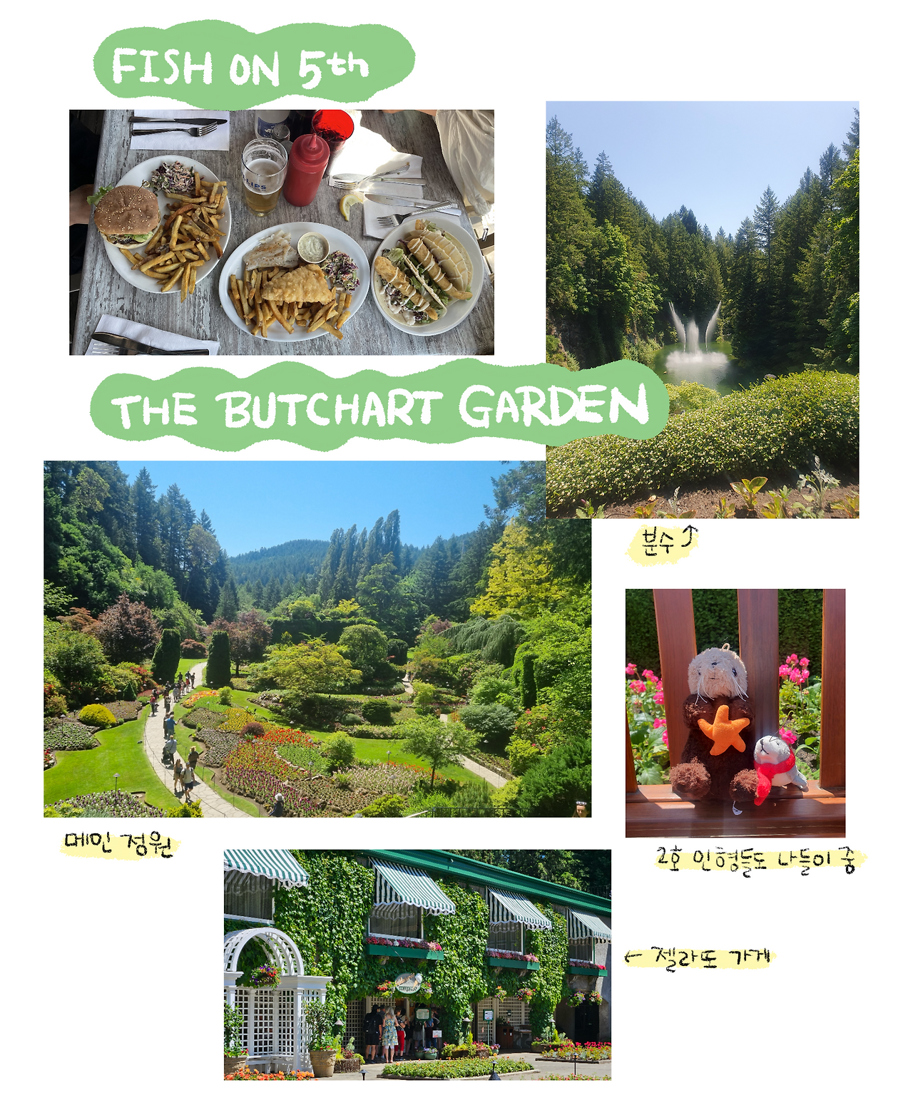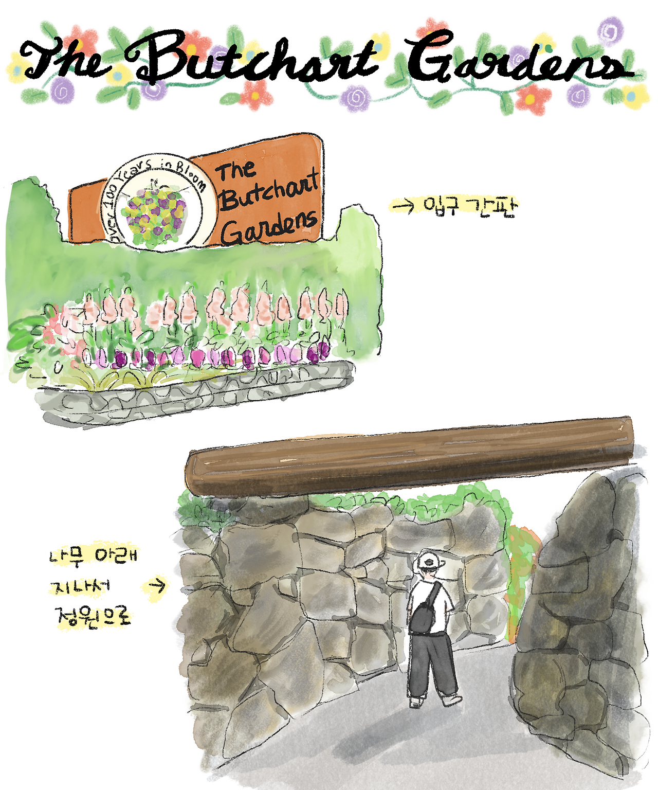 밴쿠버 섬에서 가장 유명한 관광지 중 하나인 ‘부차드 가든(The Butchart Garden)’은 약 6만 평 대지에 영국, 이탈리아, 로즈, 스타 가든 등 테마별로 조성된 정원이 있는 곳이다. 계절마다 꽃과 식물이 다르게 꾸며진다고 한다. 도착하자마자 입구에서 놓칠 수 없는 단체 사진을 찍고, 우리는 안으로 향했다. 입구에는 두꺼운 통나무가 돌담 위로 쓰러져 있어, 마치 다른 판타지 세상으로 들어가는 듯한 기분이 들었다.