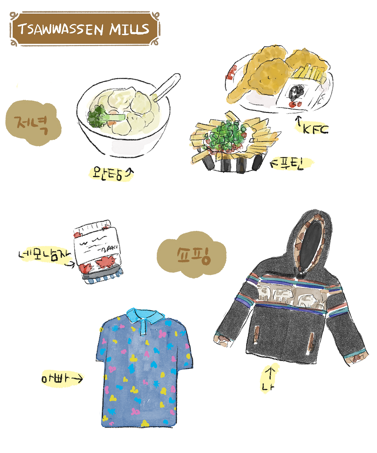 며칠째 계속되는 강행군에 모두 지쳐 있었다. 저녁을 먹으러 어디로 갈지 고민하기도 귀찮아, 트왓슨 터미널 근처 ‘트왓슨 밀스 쇼핑몰(Tsawwassen Mills)’ 푸드 코트에서 각자 아무거나 사 먹기로 했다. 아빠는 고모부와 함께 중식을, 나도 어쩌다 보니 완탕을 선택했는데, 매일 한식이나 한식과 비슷한 음식을 먹고 있는 셈이다. 아이들과 네모남자는 KFC를 먹었다. 캐나다에 왔는데 식단만 보면 마치 한국에 있는 것 같았다.