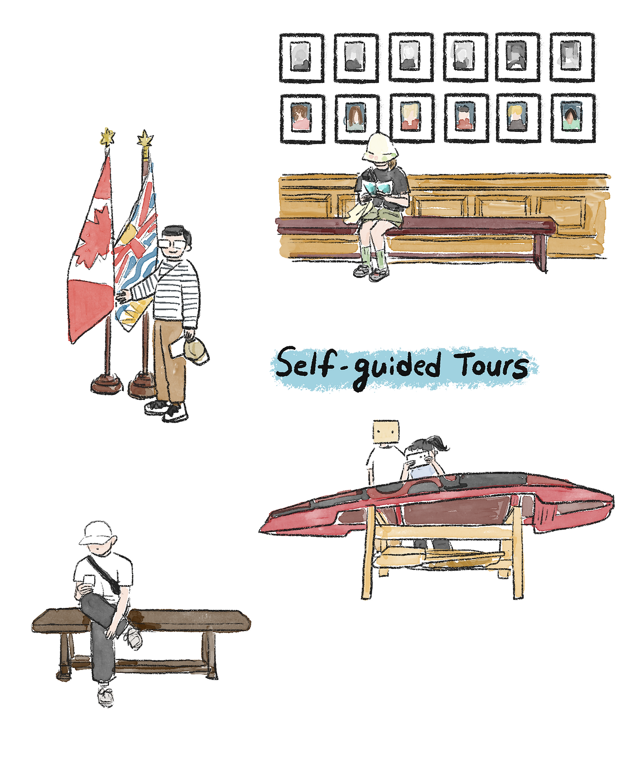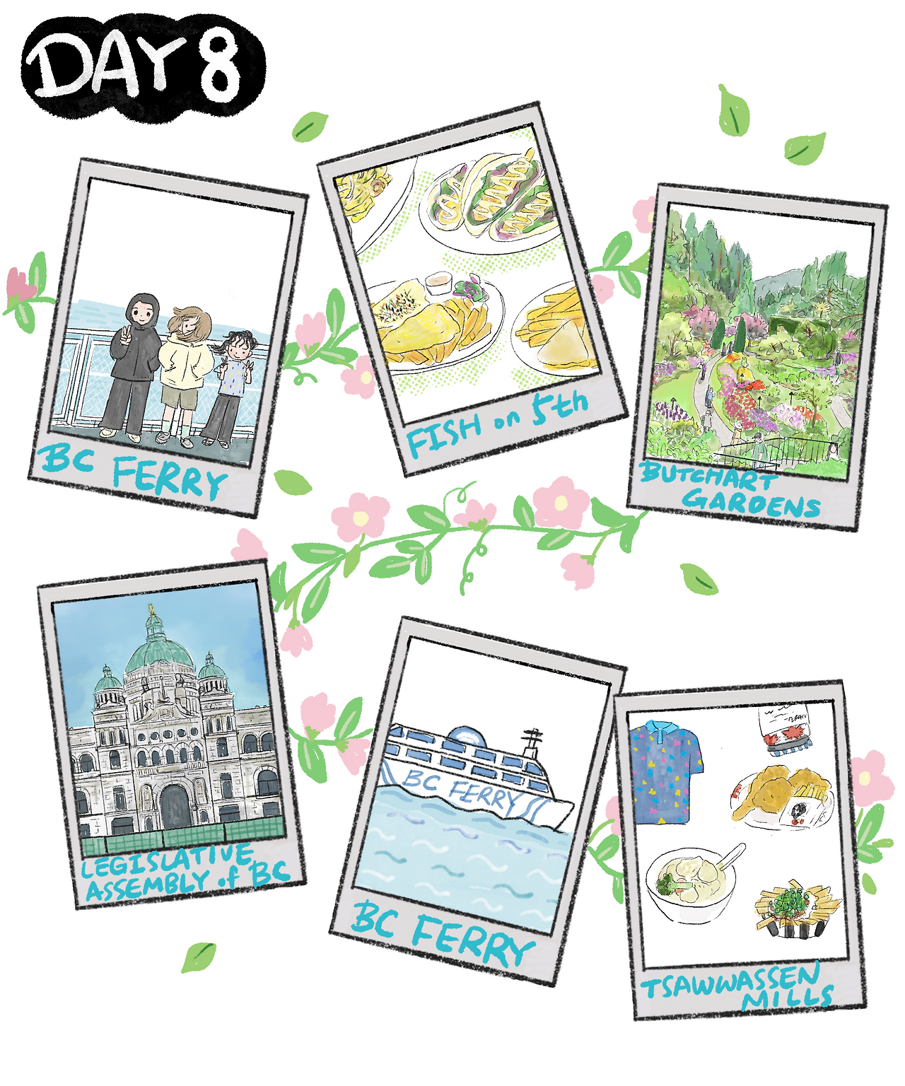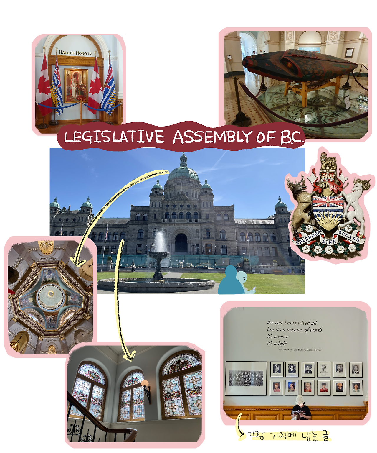 나는 브로셔의 BC주의 역사를 살펴본 후 벽에는 역대 시의원들, 주지사 사진을 훑어보았다. 그리고서는 창문의 스테인글라스, 천장의 돔과 화장실 문 창살마저도 깨알 같은 디테일들을 눈에 담았다. 내부의 메인 인테리어 말고도 곳곳에 작은 장식들을 보는 재미가 있었다. 페리 시간이 다 되어가서 우리는 주 청사 관람을 마무리 후 나와서 빅토리아를 쑥 둘러보고 항구로 왔다. 다시 페리를 타고 밴쿠버로 돌아갈 시간이다.