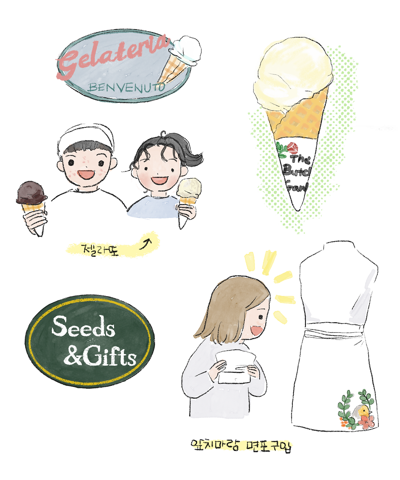 정원을 다 둘러본 후, 이름마저 부차드 가든스러운 ‘씨앗과 선물(Seeds & Gifts)’ 기념품 가게로 향했다. 무슨 기념품을 살지 고민하는 동안, 아이들은 역시나 할머니에게 젤라토를 얻어먹고 있었다. 내가 앞치마와 면포를 구입하고 나왔을 때는 이미 아이스크림을 다 먹어버려서 맛보지도 못했다. 아이들은 “마무리는 역시 아이스크림이지!”라며 만족스러워하는 것을 보니 맛이 아주 좋았던 모양이다. 오늘도 1일 1 아이스크림을 달성한 아이들이다.