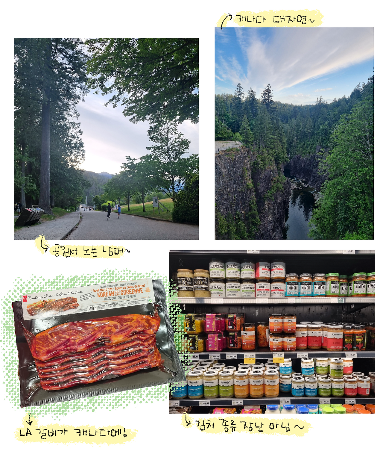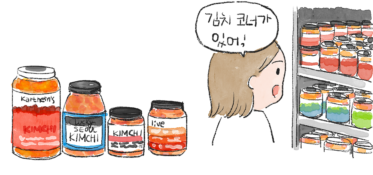 여행의 막바지라 한국에 가져갈 캐나다 식료품을 사러 밴쿠버의 월마트로 쇼핑을 갔다. 냉장 코너에서 둘러보다 보니 한 코너를 가득 채운 김치가 눈에 들어왔다. 유리병에 담긴 백김치, 빨간 김치, 매운 김치, 안 매운 김치, 비건 김치까지 다양했고, 브랜드도 여러 개였다. 마치 토마토소스처럼 작은 유리병에 영어로 KIMCHI라고 쓰여 있고 깔끔한 패키징은 분명 김치였지만, 내가 알던 김치와는 조금 다른 느낌이었다. 예전에는 ‘이상한 냄새가 나는 동양 음식’이라며 김치가 무시되기도 했는데, 이제는 눈에 잘 띄는 위치에 가지런히 놓여 있는 걸 보니 묘하게 벅찬 감정이 들었다.