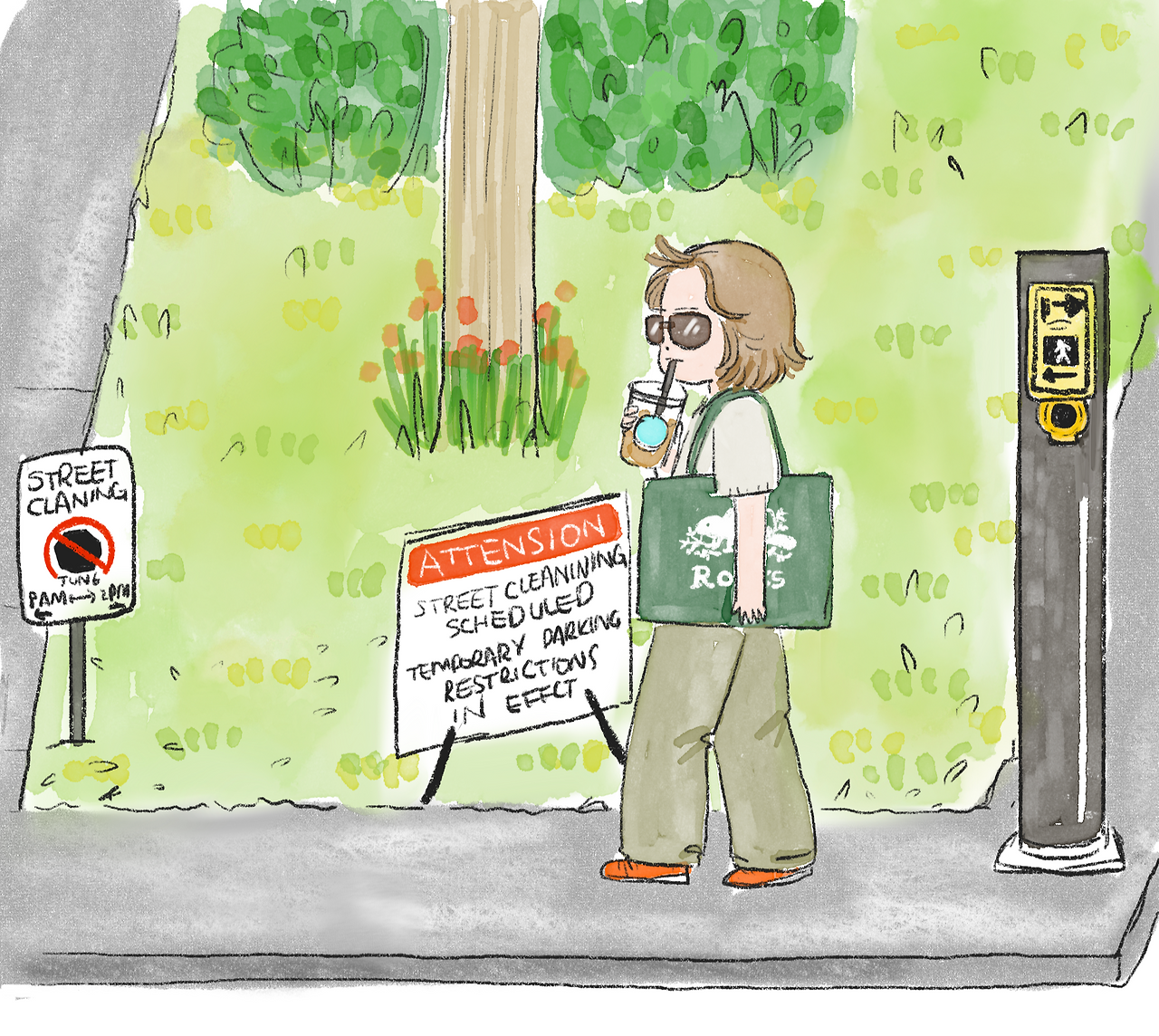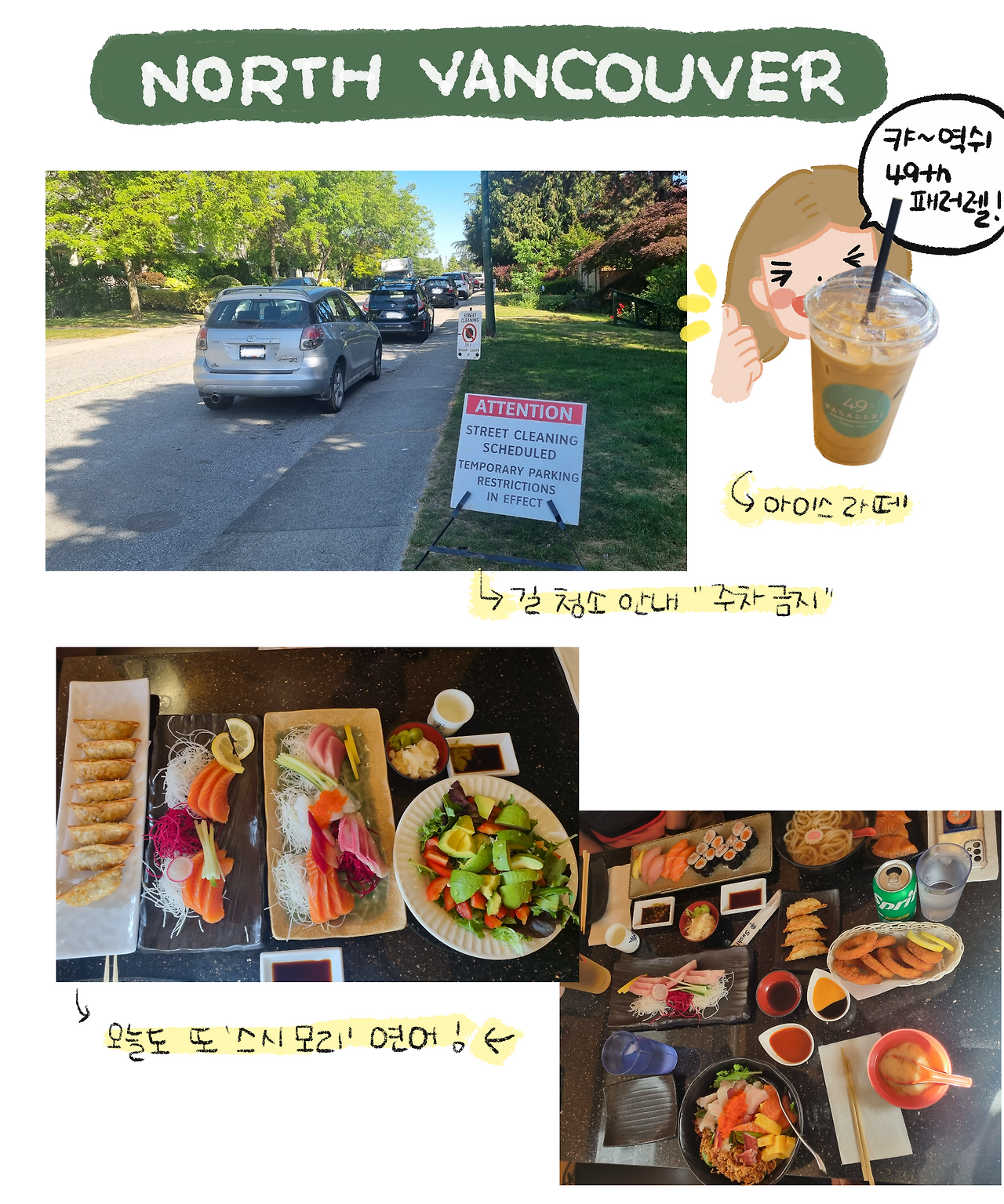 씨버스에서 내려 49th Parallel에서 아이스 라테로 기운을 충전하며 집으로 걸어오는데, 길가에 특이한 표지판들이 보였다. 길거리 청소 안내문으로, 청소 시간 내에는 주차가 금지된다는 내용이었다. 주변은 청소가 필요 없을 만큼 깨끗해 보였는데, 이런 안내판이 신기하게 느껴졌다.