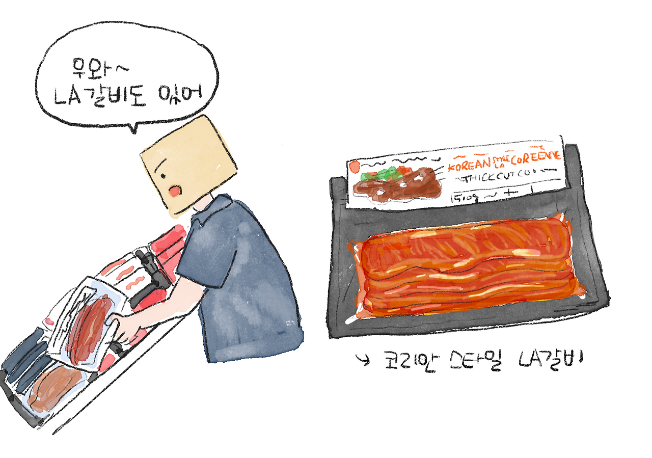 가공육 코너에서 베이컨을 고르다 보니 Korean Style LA 갈비도 보였다. 캐나다에서 LA 갈비를 보다니, 김치보다 더 신기했다. 냉동식품 코너에서도 Korean이라고 적힌 음식들이 여러 종류 눈에 들어왔다. 김치 같은 대표적인 한국 음식이 아니라 다양한 한식이 한인 마트가 아닌 캐나다 마트 곳곳에 자리 잡고 있다는 점에서, 한식이 그만큼 사람들에게 친숙해졌음을 느낄 수 있었다. 어느새 식문화까지 널리 퍼진 한류였다. 처음 캐나다에 왔을 때만 해도 대부분의 캐나다인들이 한국이란 나라를 잘 알지 못했는데, 이제는 마트에서 한국식 음식들이 인기리에 팔리고 있으니 한국인으로서 뿌듯하고 기쁜 일이었다. 나는 마트에 한국에 가져갈 캐나다 음식을 사러 왔지만, 오히려 높아진 한류의 위상을 느끼고 돌아왔다.