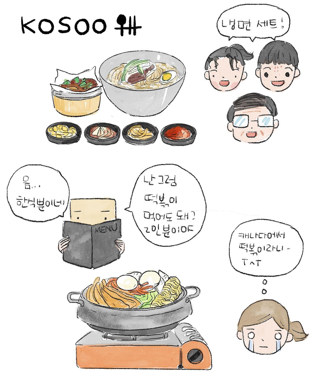 내일이면 한국으로 돌아가는데, 오늘의 점심 메뉴는 안타깝게도 한식으로 결정되었다. 며칠 전에 왔다가 브레이크 타임이라 먹지 못한 아버지가 좋아하는 냉면을 먹으러 다운타운의 한식당 고수 KOSOO로 향했다.
