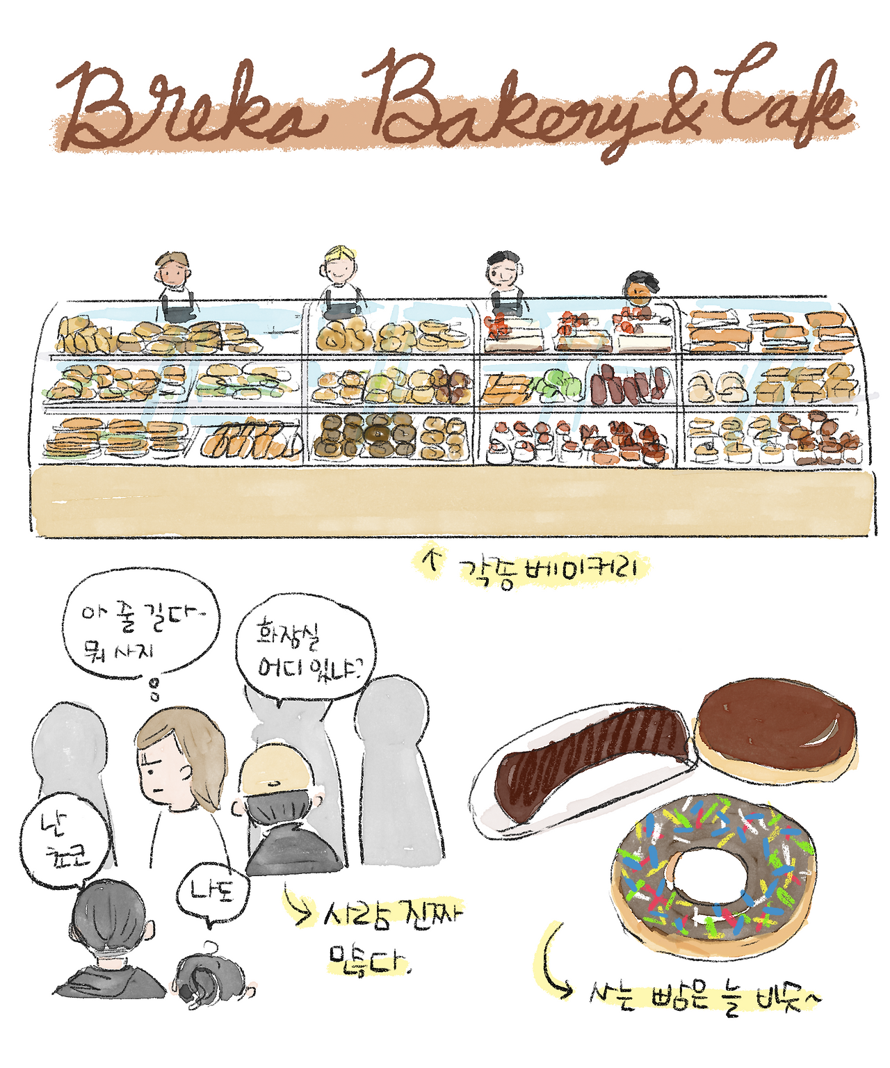 떡볶이 양이 엄청나서 배가 터질 듯했지만, 대식가로 변한 나는 브레카 베이커리 카페(Breka Bakery & Cafe)로 향했다. 솔직히 이 집 빵이 특출 나게 맛있는 편은 아니지만, 종류가 다양하고 가격도 적당해서 디저트 빵이나 케이크가 먹고 싶을 때 종종 찾게 된다. 기다리는 사람들의 줄이 길어, 나도 간신히 줄 끝을 찾아 서 있었다. 이곳은 빵을 직접 담지 않고 점원에게 요청하면 진열장 뒤에서 담아주기 때문에 먹고 싶은 빵이 보이면 바로 주문하는 것이 좋다. 줄이 길어서 마치 컨베이어 벨트 위에 선 것처럼 진열장을 옆에 두고 지나가며 주문하게 되고, 사람이 많아 되돌아볼 틈이 없기 때문이다.