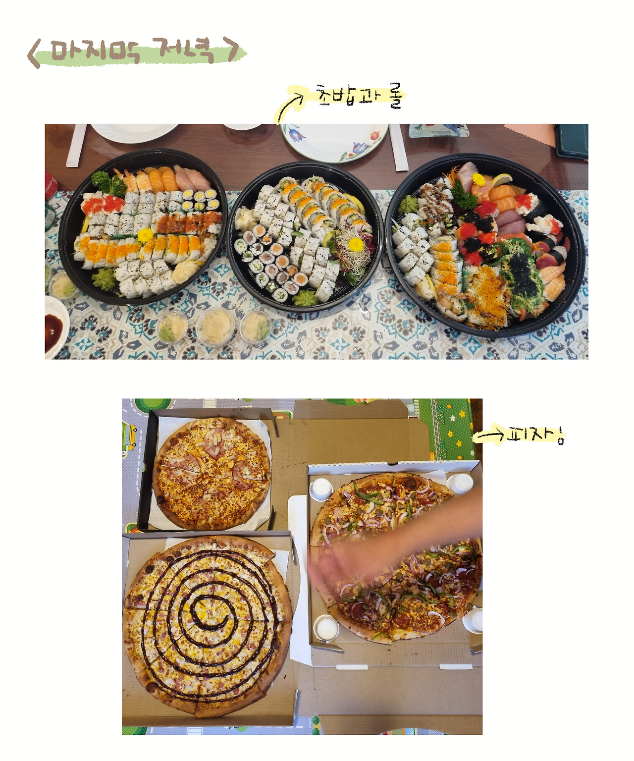 그리고 마침내 캐나다에서의 마지막 날 저녁이 되었다. 고모는 우리를 위해 다시 연어 음식을 준비해 주셨고, 사촌 동생 부부가 사 온 피자와 함께 마지막 만찬을 즐겼다. 이번 여행에서 못 먹어본 것이 너무 많은데 벌써 10일이 지나고 한국으로 돌아가야 할 시간이라니 믿기지 않았다.