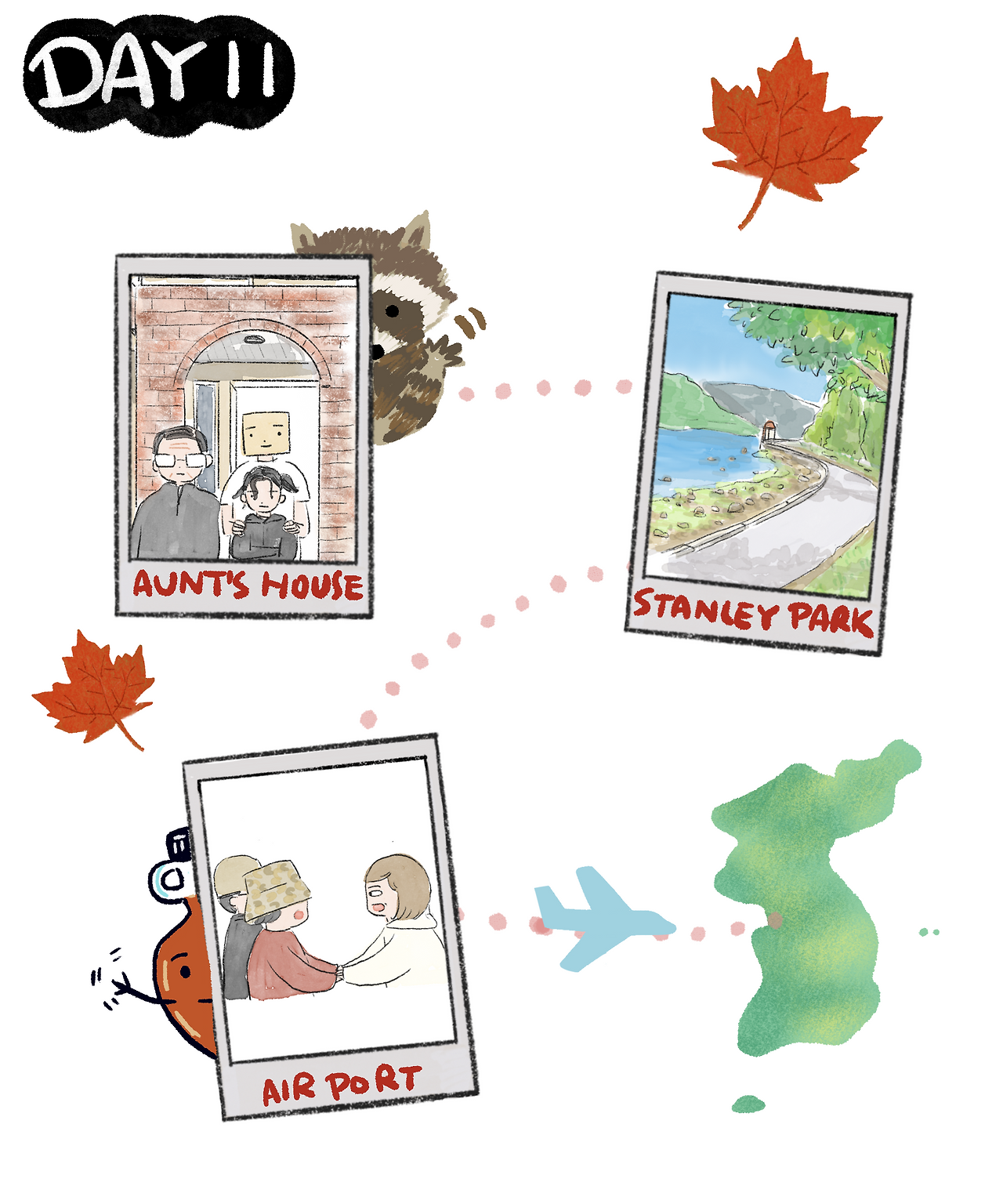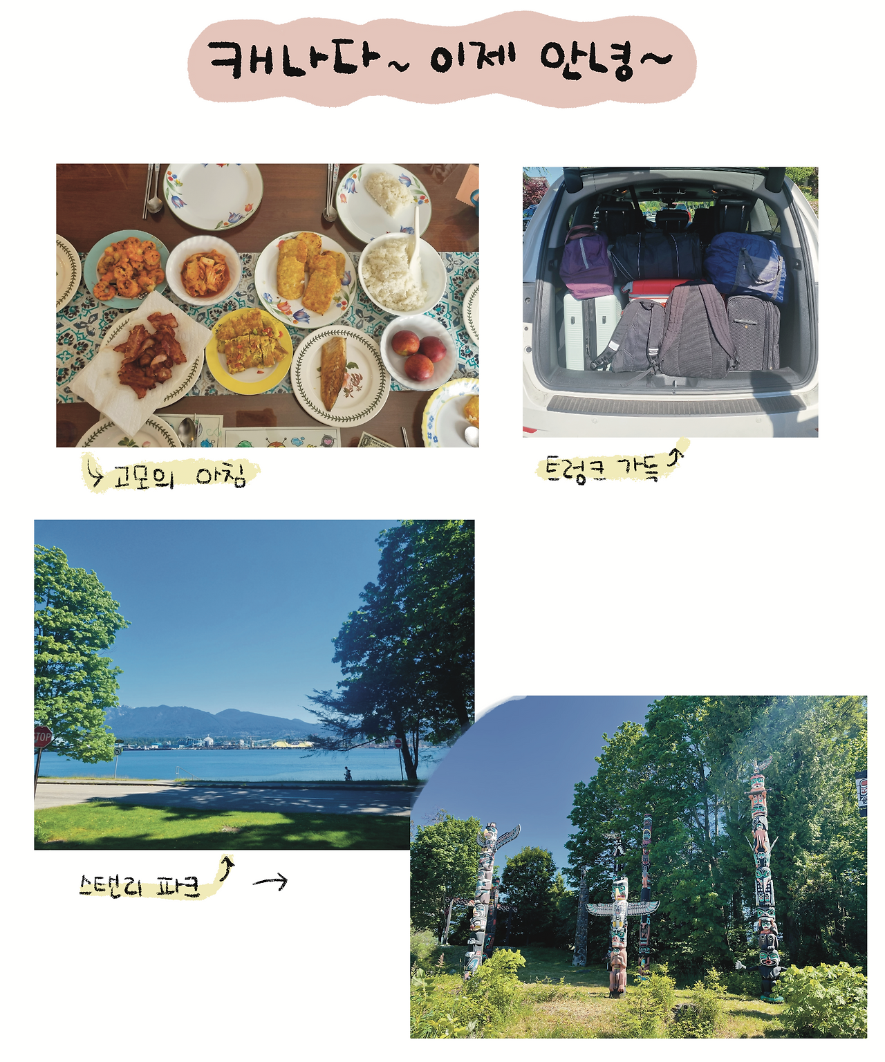 우리의 애초의 계획은 사실 밴쿠버 -캘거리 여행이었으나, 아버지 디스크 수술로 최소한의 이동을 위해서 캘거리행을 취소했었다. 그러나 아버지는 막상 캐나다에 오시니 마음이 변하셨는지 캘거리도 다녀오시겠다고 하여 우리는 한국으로 아버지는 캘거리로 가기로 했다. 공항에서 우리는 각자 비행기를 타러 각자 찢어져야 했다.