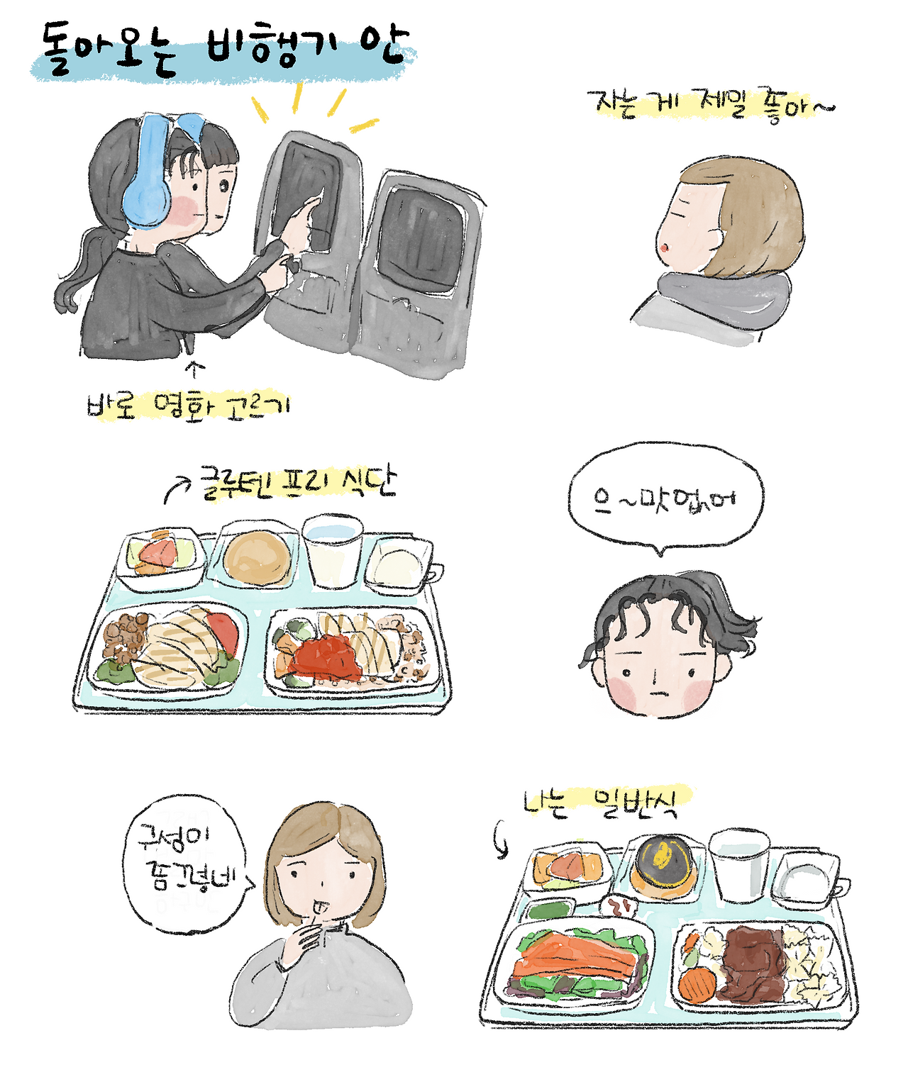 돌아오는 비행기 안에서 아이들은 역시나 영화 삼매경에 빠져 있다. 기내식은 늘 안 먹으면 아쉽고, 먹으면 그냥 그렇지만 그래도 소고기 메뉴는 맛있었다. 이렇게 우리의 캐나다 여행이 끝이 났다.