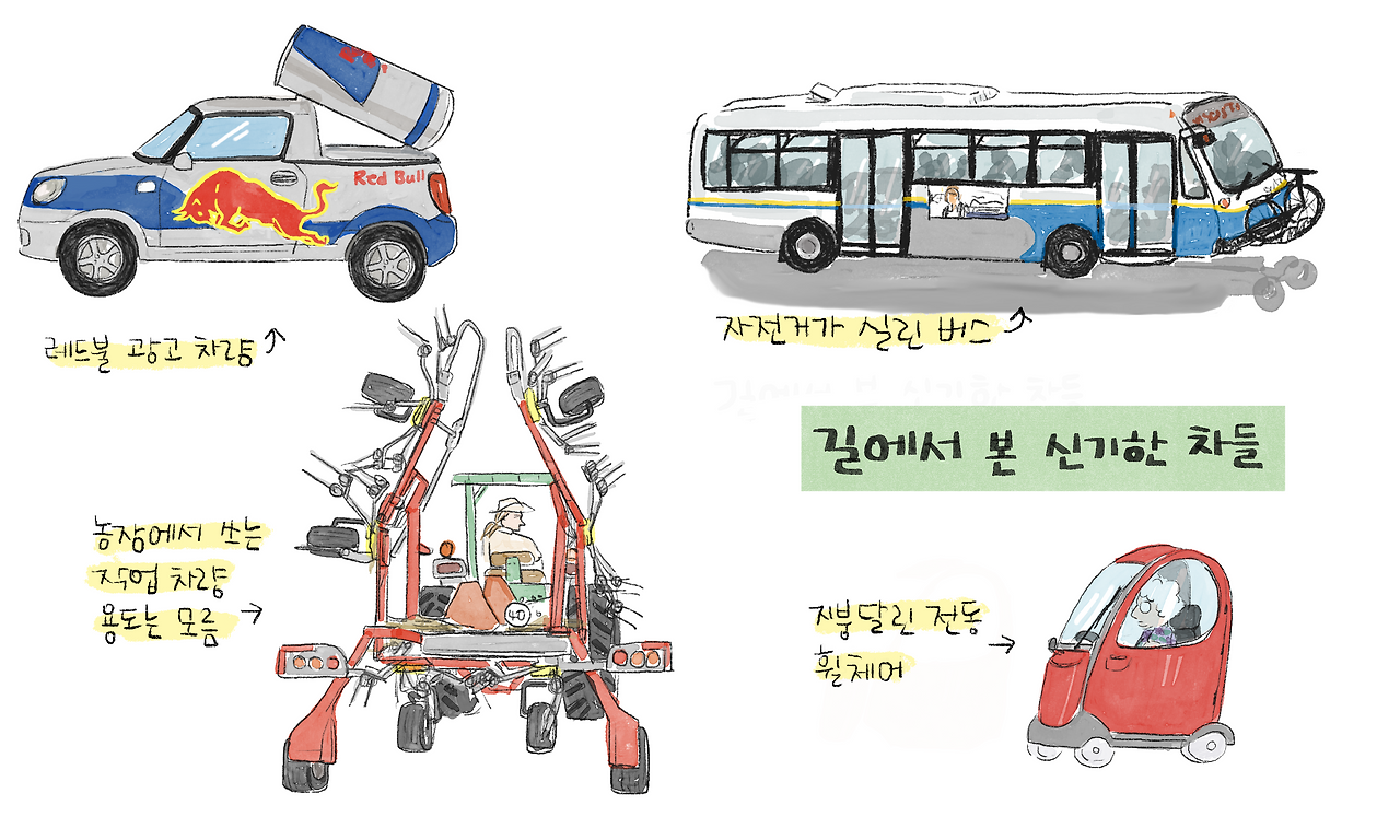 길에서 볼 수 있는 자동차는 어느 나라 가든 똑같다고 생각하겠지만 그래도 나라마다 조금씩 다르다. 캐나다 차들은 앞유리와 앞 좌석은 선팅이 금지라서 운전자들의 얼굴을 알아볼 수 있고 버스에는 자전거를 실을 수 있는 랙이 있다. 부차드 가든을 가는 길에는 농기계를 끌고 가는 아저씨를 보았는데, 단연코 그 농기계는 내가 본 차 중에 가장 용도를 알 수 없었다. 커다란 레드불을 싣고 다니는 홍보 차량을 보고도 나는 신기해했는데 네모남자는 한국에서도 흔히 볼 수 있다고 했다. 그리고 노인들은 전체가 닫힌 형태, 지붕만 달린 것, 그냥 휠체어 등 각양각색의 이동 보조수단을 타고 다니셨다.
