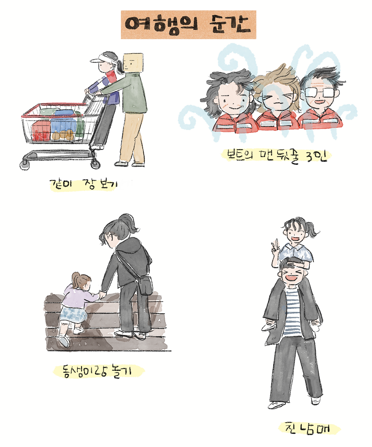2호가 탈 수 있을 정도로 마트의 커다란 카트, 보트의 뒷좌석에 바다의 찬바람에 유일하게 신났던 아빠, 사촌 동생의 아이들과 만나서 즐겁게 노는 남매 대 남매, 이런 사소하고 작은 우리의 경험이 여행이어서 더 특별하게 기억으로 남는다.