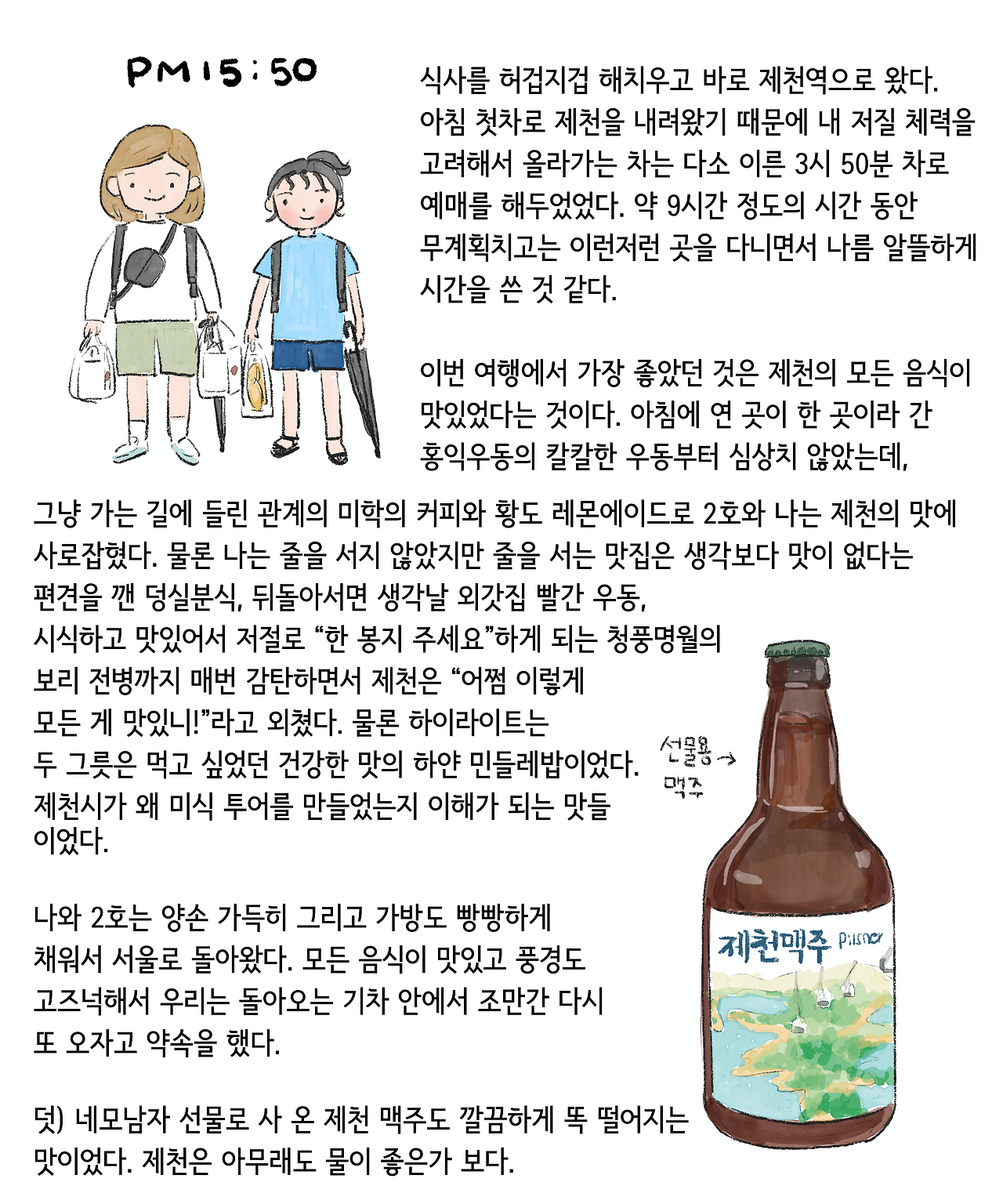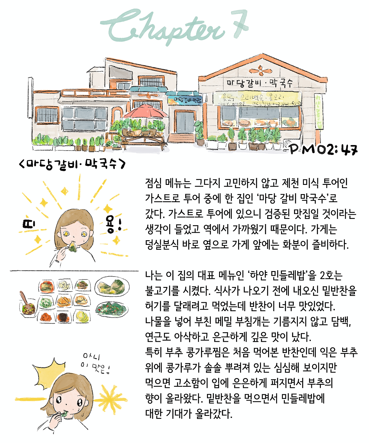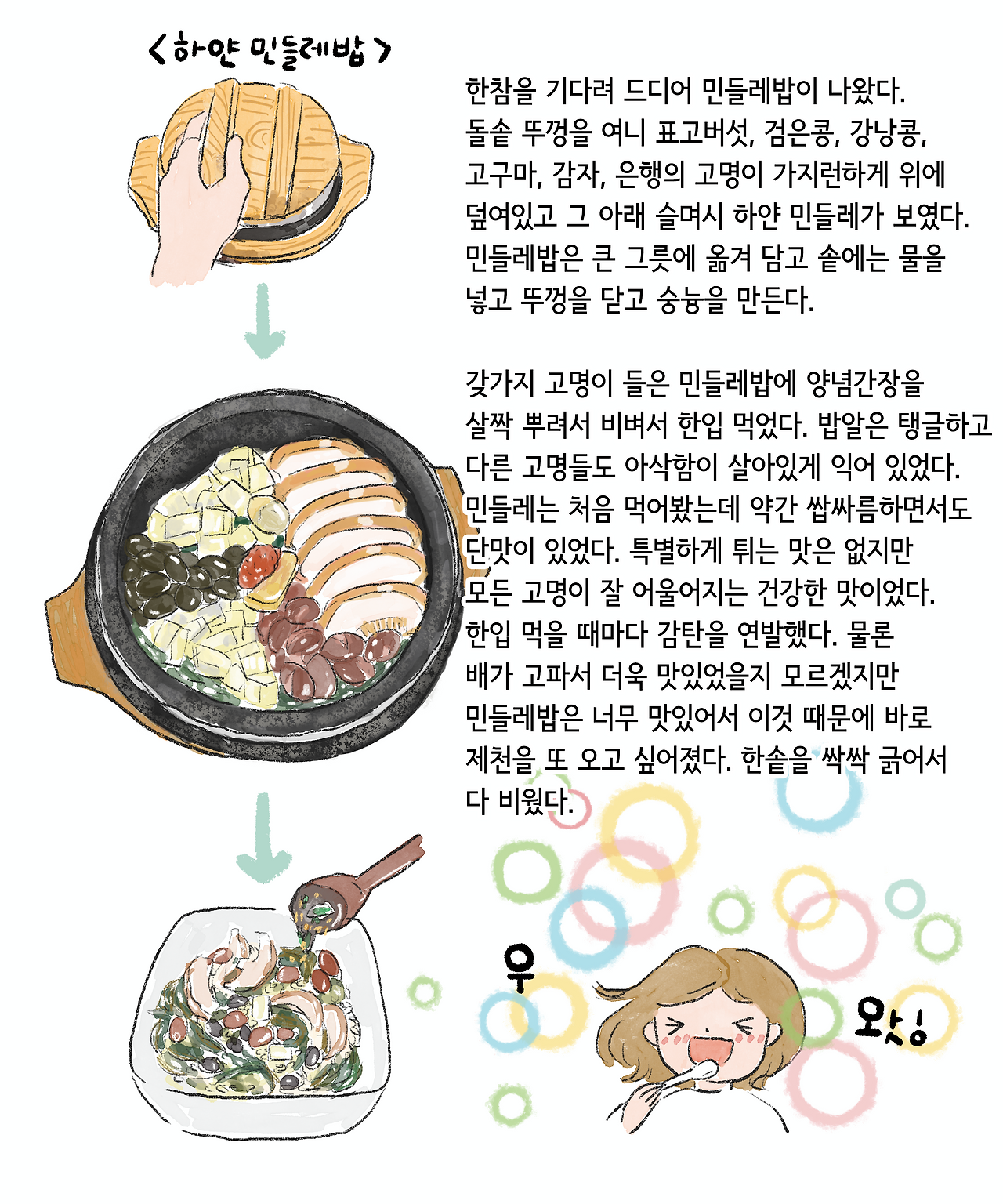 이 그림을 그리는 순간에도 하얀 민들레밥을 먹으로 제천에 가고 싶다는 생각이 강렬했습니다. 하얀 민들레밥은 정말 너무나 제 취향이었는데 이 글을 보고 뭐야 맛없잖아라고 생각할 수 있는 사람도 있는 것을 압니다. 아마도 네모남자 같은 사람이겠지요. 그러나 저에게는 정말 대미를 장식하는 맛이었습니다. 건강하고 심심한 맛을 좋아하시는 분들을 모두 좋아하실 맛이라고 생각합니다.