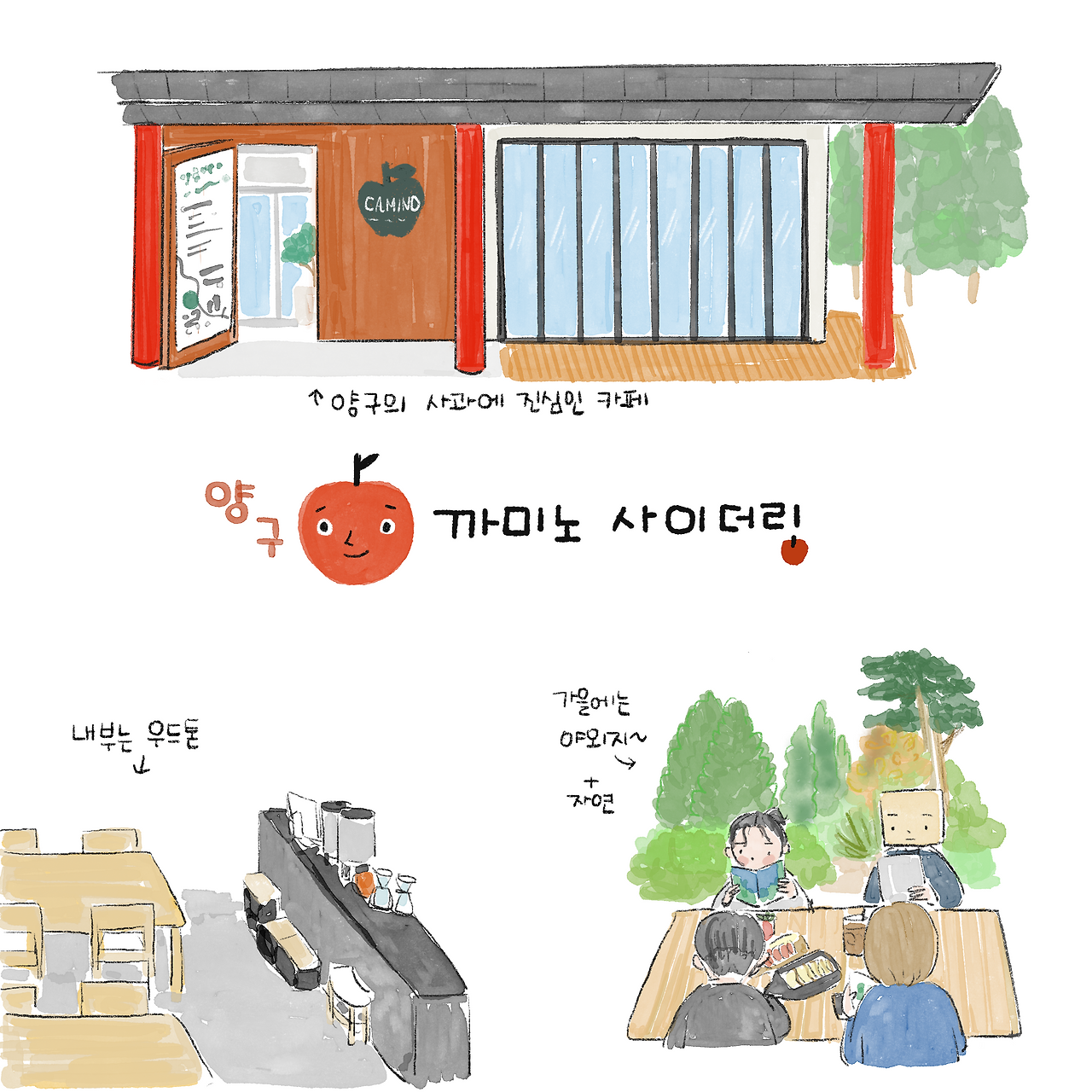 '까미노 사이더리' 카페를 알게 된 것은 순전히 사과 때문이다. 아삭하고 새콤한 사과를 좋아하는 둘째를 위해 맛있는 사과를 찾아 검색하던 중, 양구에 있는 사이더리에서 사과를 발효해 식초를 만든다는 사실을 알게 되어 가보게 되었다. 천문대 근처 길가에 작은 간판을 보고 들어가면 빨간 기둥이 눈에 띄는 곳이 바로 '까미노 사이더리'이다. 카페 뒤쪽에는 주차장이 있고, 앞쪽에는 캠핑장과 나무들이 자리하고 있다. 가게 안은 그리 크지 않지만, 우드톤의 인테리어로 차분하고 내츄럴한 분위기가 느껴진다. 그래도 우리는 강원도에 온 만큼 더 자연에 가까이 앉고자 주로 나무들이 보이는 야외 테이블에 앉았다.