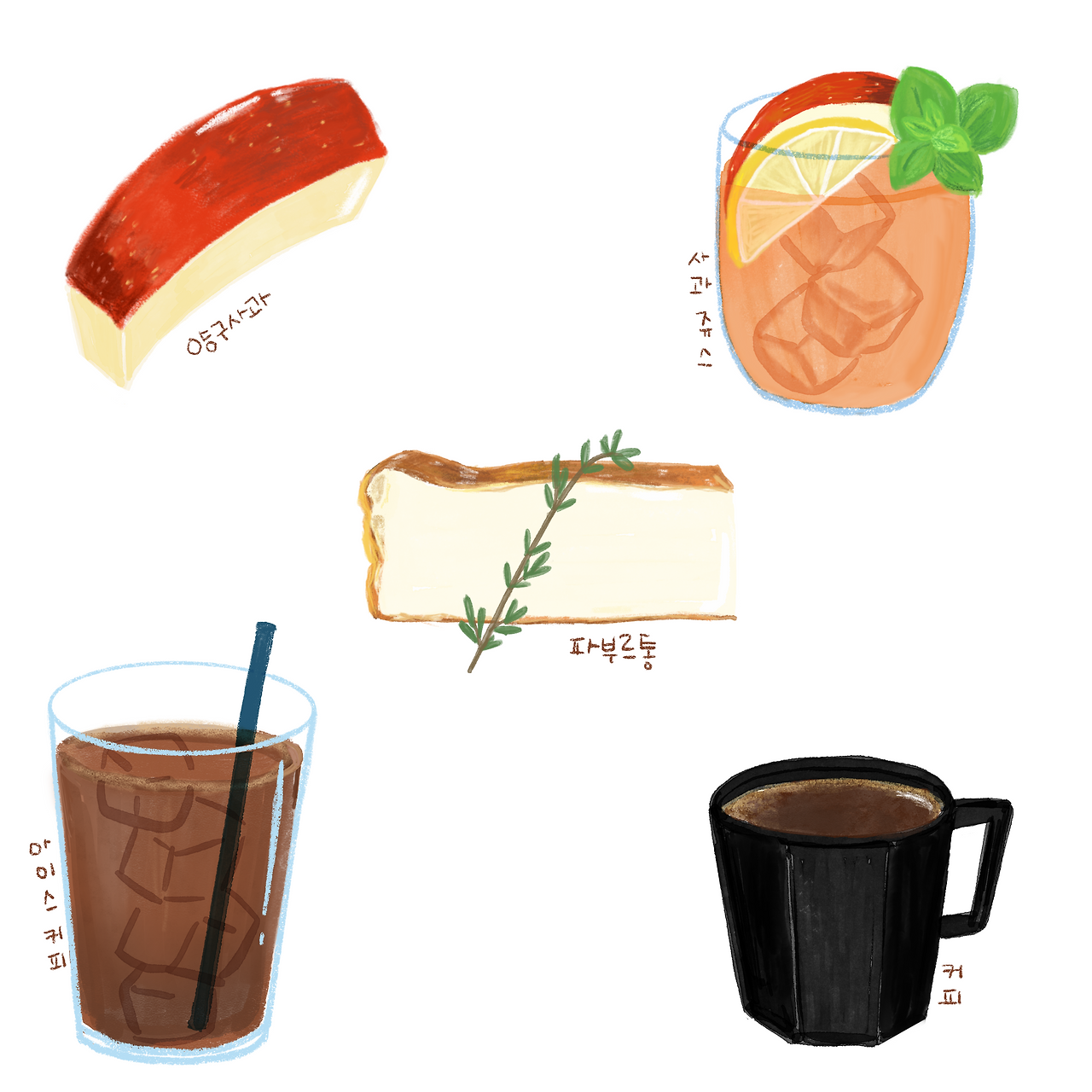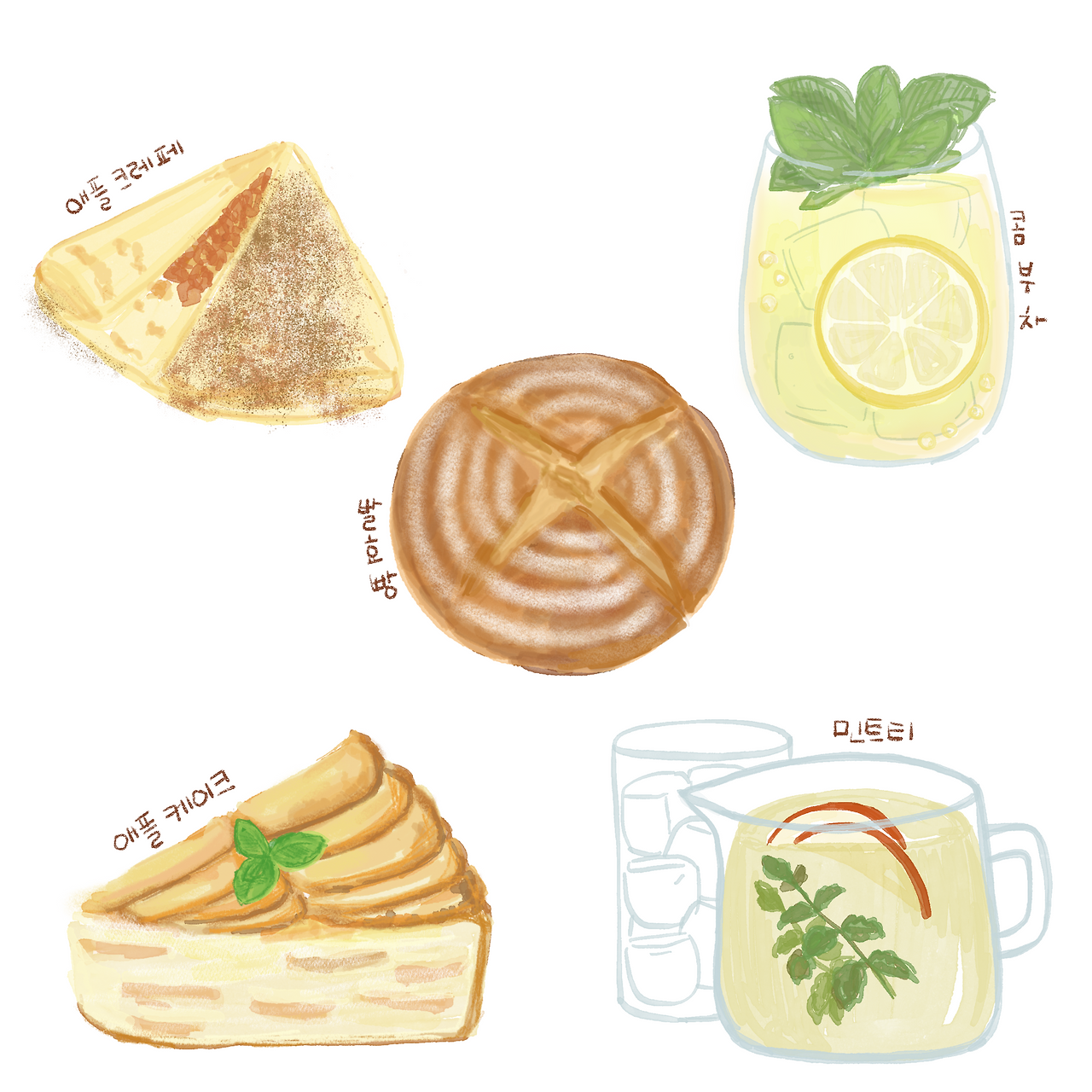 그리고 이 카페의 메뉴도 사과에 진심인 사장님들 덕분에 대부분 사과와 관련된 것들로 구성되어 있다. 처음 이곳을 방문했을 때는 발효빵이나 크레페 등 다양한 메뉴가 있었지만, 현재는 약간의 메뉴 조정을 거쳐 조금 더 단출한 구성을 유지하고 있다. 사장님이 직접 발효한, 약간 쿰쿰하면서도 상큼한 향이 나는 탄산이 톡 쏘는 콤부차, 사과가 들어 있어 더욱 맛있는 상쾌한 민트티, 그리고 생사과가 가득 들어간 영국식 애플케이크 등이 있다. 이 케이크는 사과를 조려서 만드는 애플파이보다 가벼운 식감으로 사과의 새콤함이 살아 있는 것이 특징이다.
