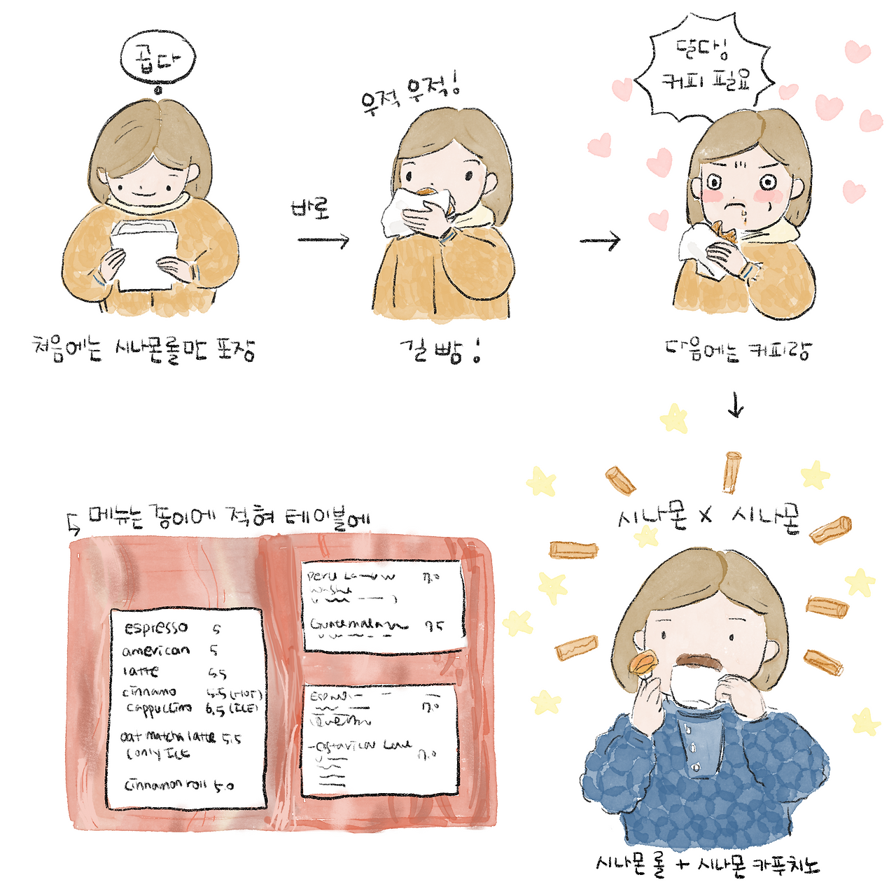 그리고 커피와 함께 시나몬롤을 다시 즐기기 위해 재방문했다. 메뉴판을 쳐다보며 고민하다가 결국 시나몬 카푸치노와 시나몬롤을 주문했다. 둘 다 너무 좋아하는 메뉴라서 하나만 고를 수가 없었다.