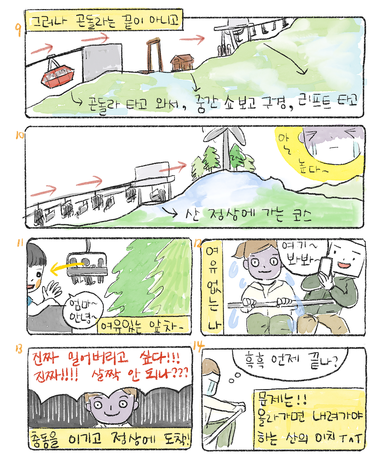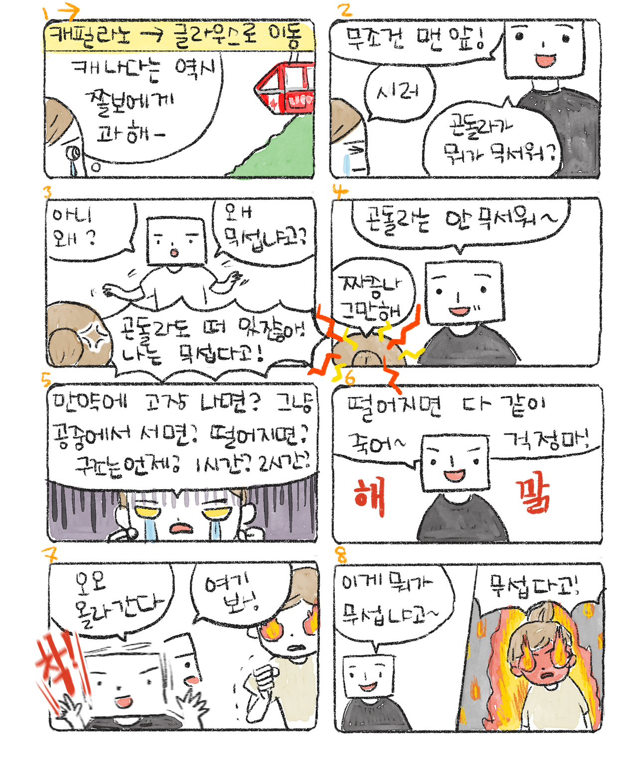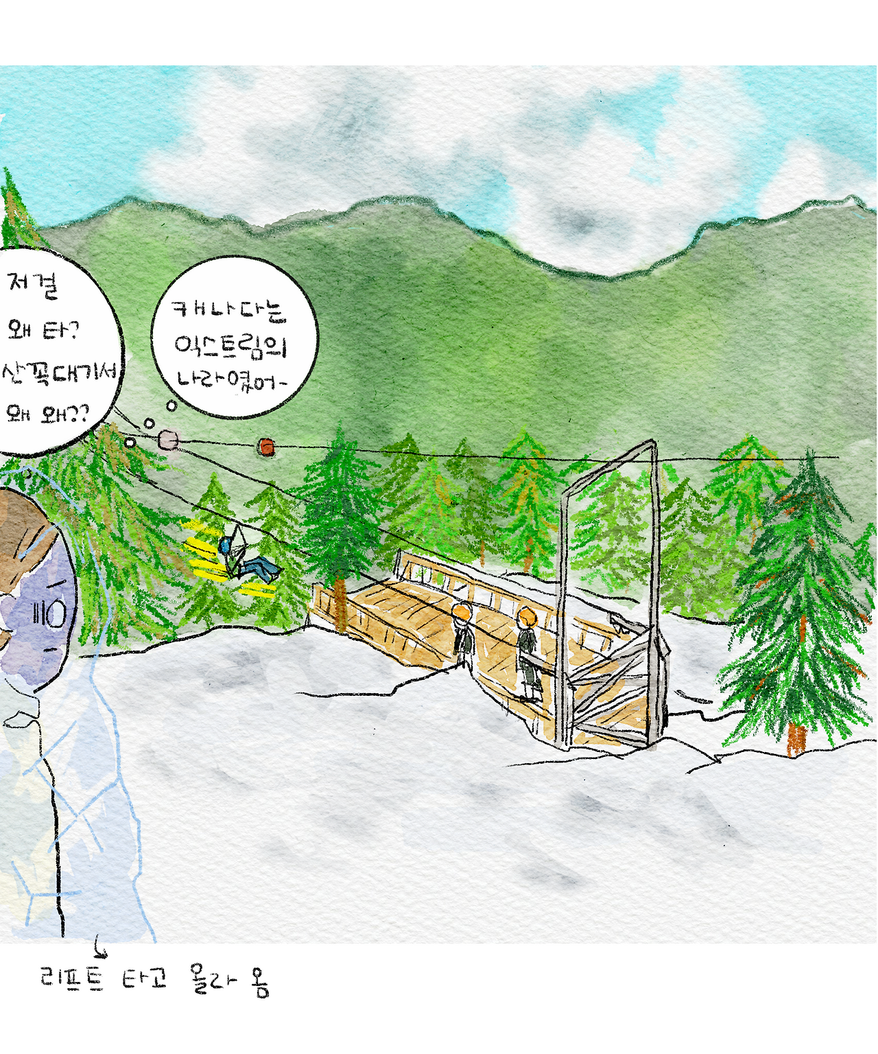쇼가 끝나자 미루고 싶었던 리프트 탈 시간이다. 리프트를 타자마자 나는 메두사를 본 것처럼 돌처럼 굳어 안전바를 꽉 쥐고 미동도 하지 않았다. 아니, 할 수가 없었다. 얼음 자세로 산 정상에 도착했다.