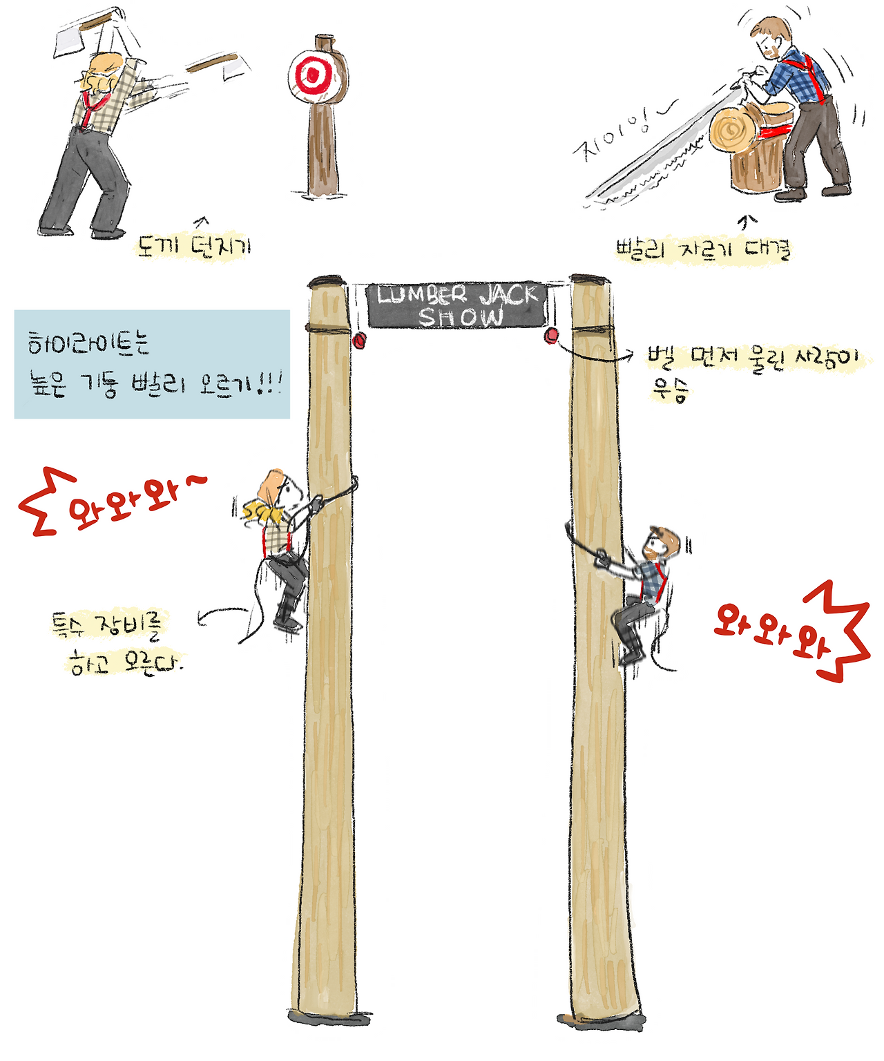 럼버잭 쇼에는 벌목꾼 두 명과 사회자가 나와 다소 재미없는 농담을 주고받으며 나무 자르기 등 여러 가지 대결을 펼친다. 그중 하이라이트는 높은 나무기둥 빨리 오르기 대결이다. 블루 팀과 레드 팀으로 나뉘어 서로 팀을 응원하는데, 처음엔 쇼가 심심하다고 생각했지만 나도 모르게 과몰입해서 "블루!"를 외쳤다. 하지만 아쉽게도 우리 팀이 지고 말았다.