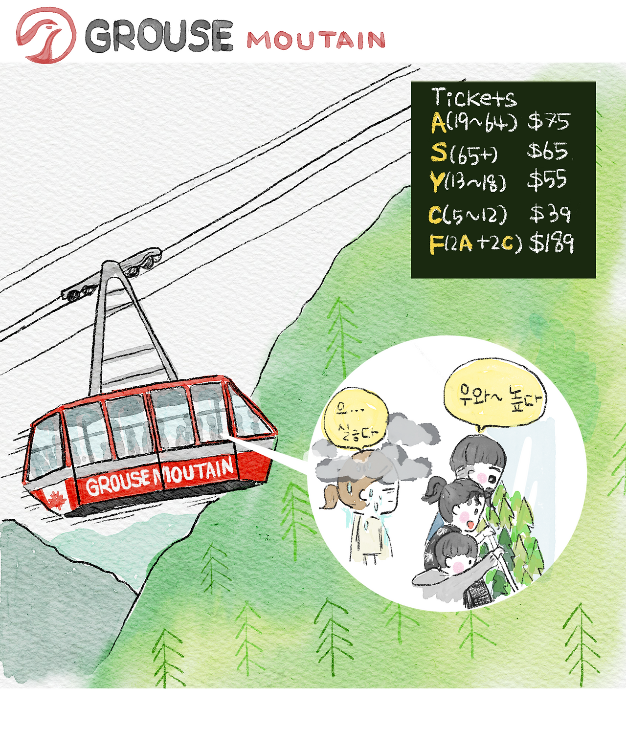 점심 식사 후 우리는 글라우스 마운틴으로 향했다. 해발 1,250m 높이의 글라우스 마운틴은 밴쿠버 도심에서 15분 거리에 있어 많은 사람들이 찾는 명소다. 여름에는 하이킹, 겨울에는 스키 등 겨울 스포츠를 즐길 수 있는 곳이기도 하다.