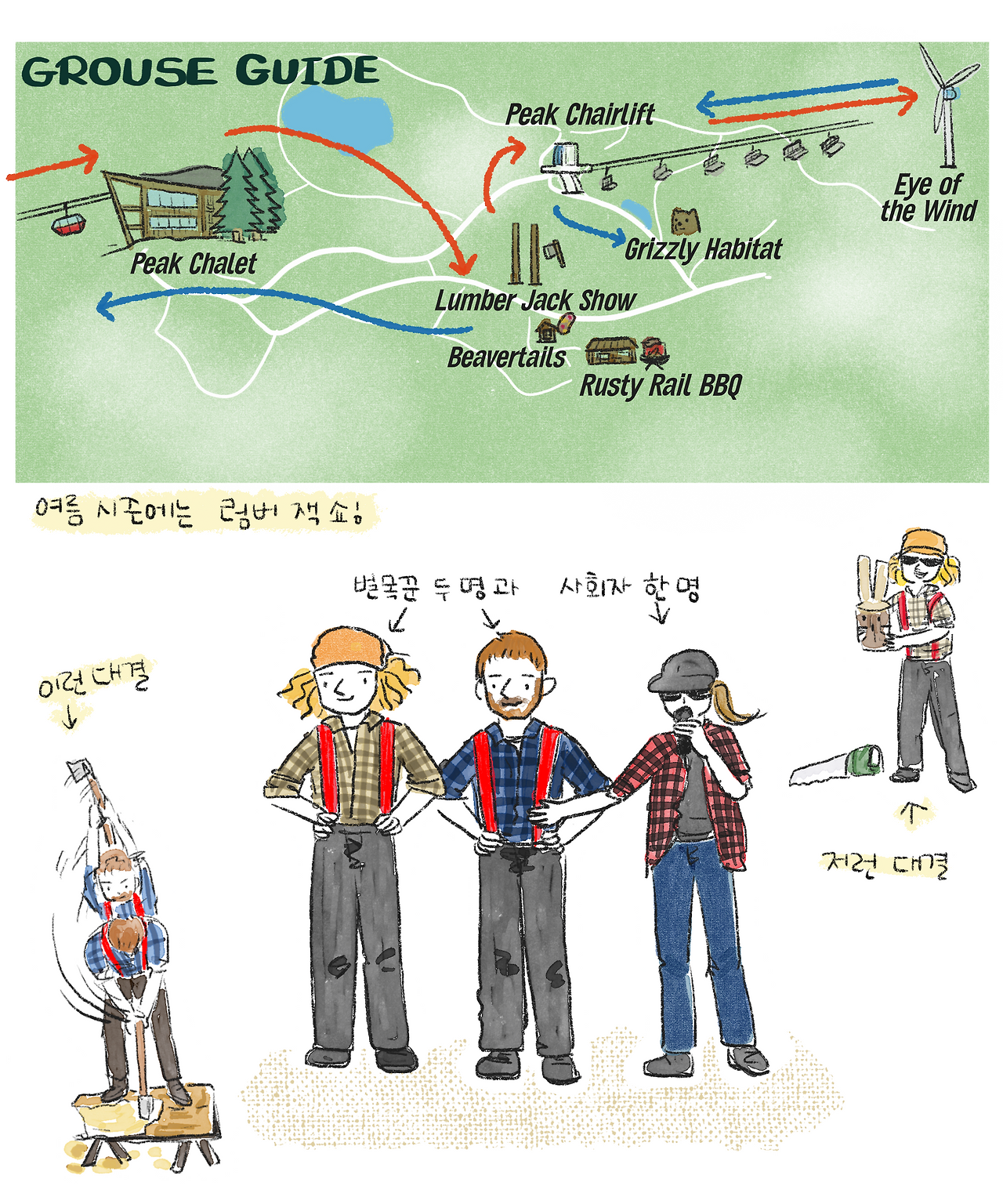 아무튼 먼저 곤돌라를 타고 산 중턱쯤의 Peak Chalet에 도착하면 여러 가지를 소소하게 즐길 수 있다. 여름 시즌의 가장 큰 이벤트는 '럼버잭 쇼'다. 마침 쇼 시간이어서, 우리는 쇼를 먼저 보고 리프트를 타기로 했다.