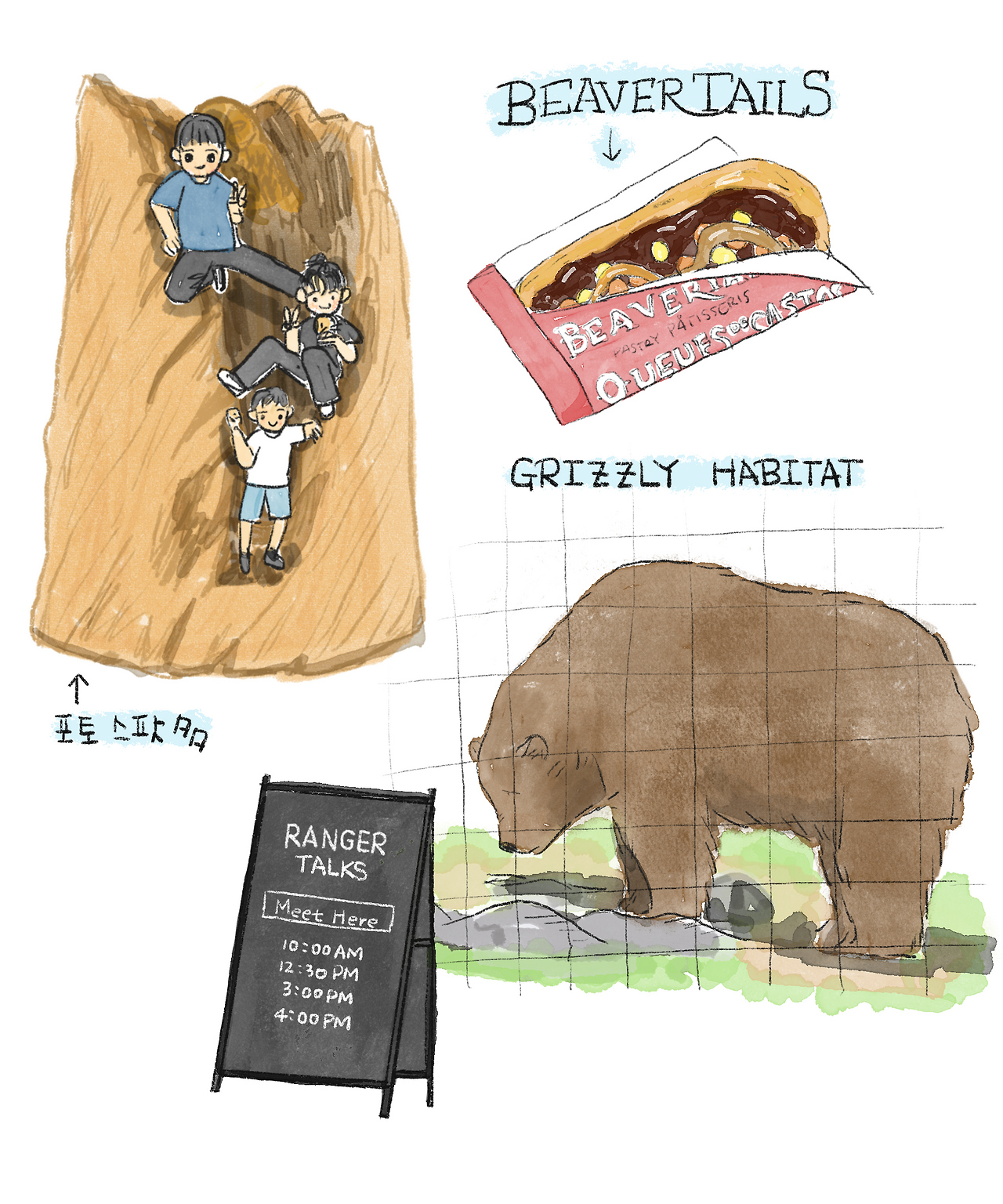 산을 내려가기 전, 고아가 된 곰을 보호하는 '그리즐리 서식지'에 들렀는데, 아이들은 레인저의 설명이 재미없다며 그냥 지나쳤다. 아이들은 오히려 나무 커다란 밑동에 동물을 새겨 놓은 포토 스폿마다 올라가 사진 찍기에 더 관심이 많았다. 한편, 작은 오두막에서는 캐나다의 대표 간식 '비버테일'을 팔고 있었다. 메뉴는 많지 않지만, 글라우스 마운틴 정상에서 즐기는 비버테일은 또 다른 매력을 준다.