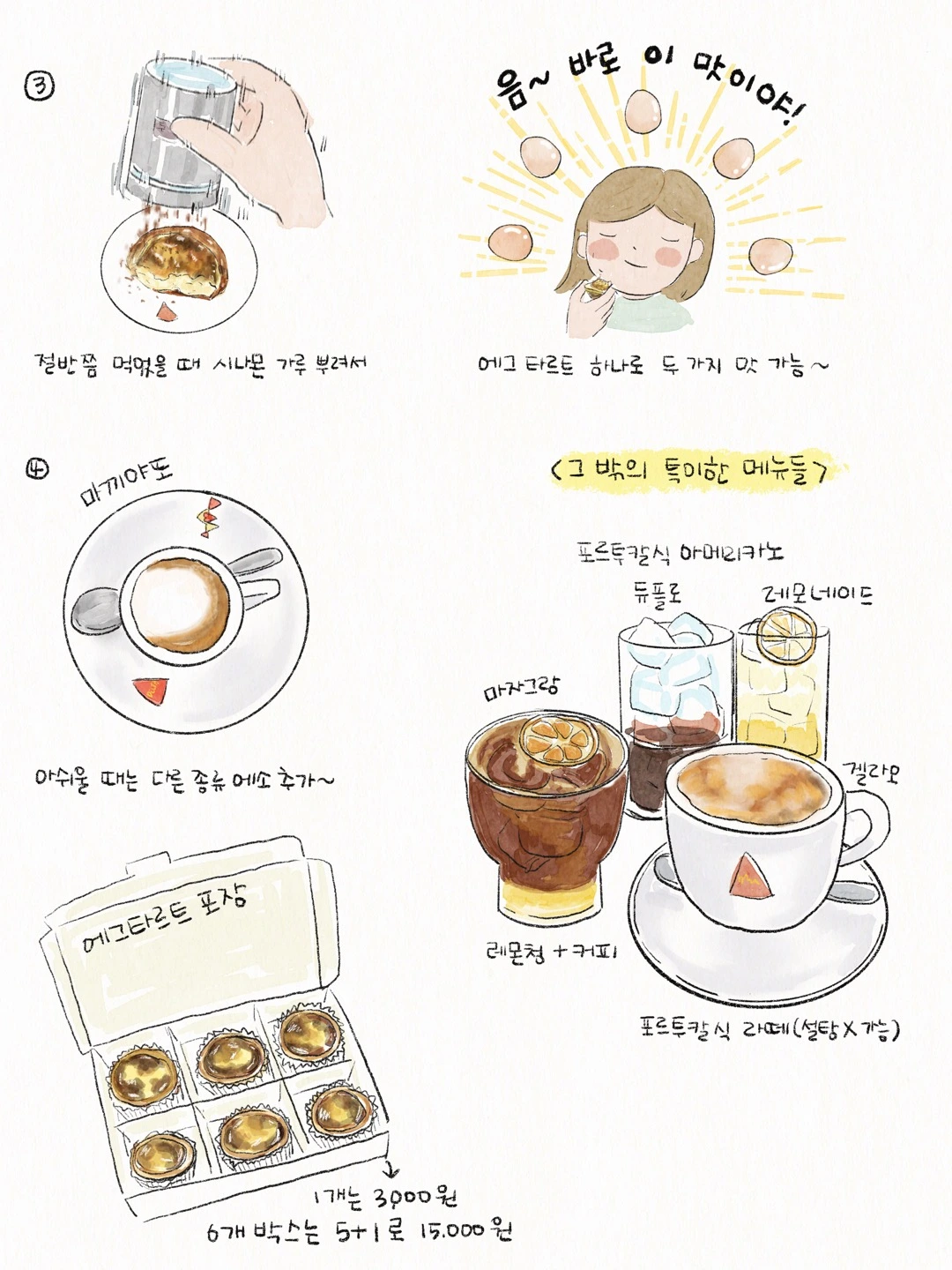 에그타르트 맛집인 만큼, 에그타르트와 기본 에스프레소 조합의 콤보를 주문했다. 포르투갈에서 공수한 생지와 크림으로 만든 에그타르트는 부드럽고 달콤한 크림과 얇고 바삭한 페이스트리가 잘 어울린다. 크림이 약간 담백한 편이라서 반쯤은 그냥 먹고, 나머지 반은 시나몬 가루를 듬뿍 뿌려 먹으면 또 다른 매력이 있다.