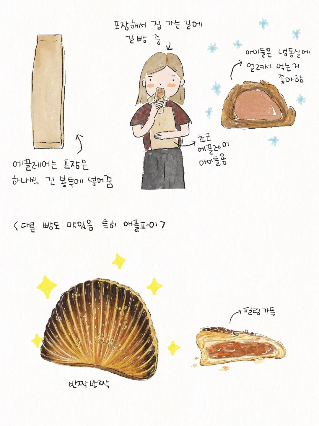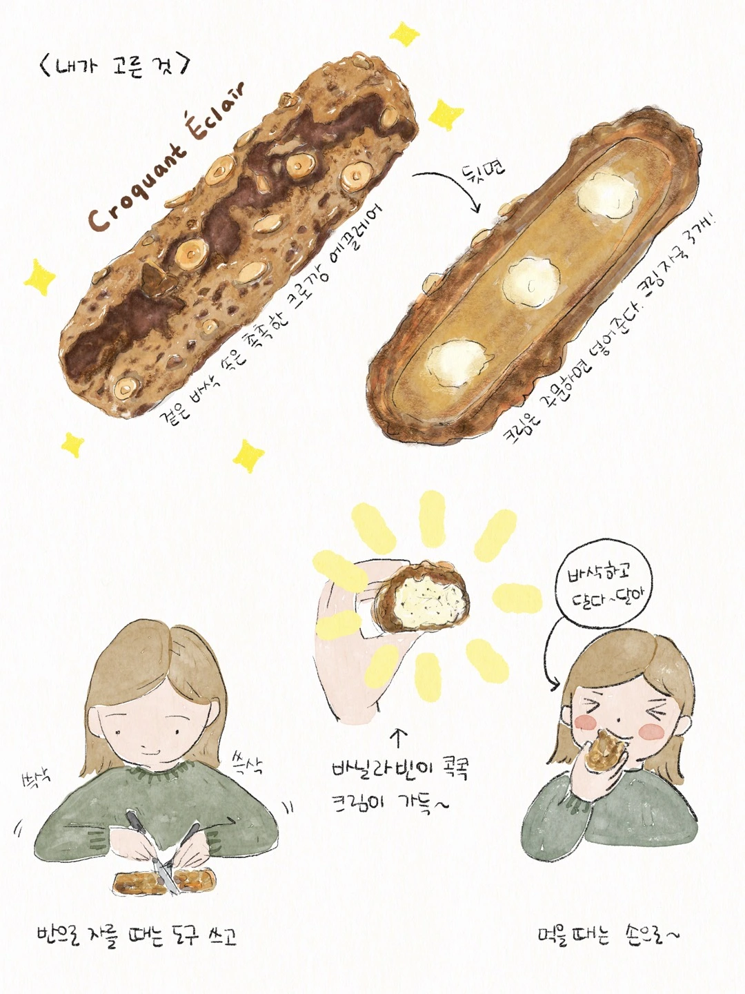 가끔 아주 단 것이 당길 때 이곳에 들러 크로캉 에끌레어를 먹으면 바로 행복해질 수 있다. 역시 탄수가 주는 위대한 자비심은 효과가 엄청나다. 에끌레어를 포장할 때 길에서 참지 못하고 바로 꺼내 먹을 정도로 유혹적인 디저트다. 만약 길에서 다 먹지 않고 끝까지 참고 집까지 가져온다면, 냉동실에 잠깐 얼려서 먹는 것도 추천한다. 그리고 이곳은 에끌레어뿐만 아니라 다양하고 맛있는 빵이 가득하니, 한 번쯤 들러 에끌레어와 같이 다른 것도 즐겨보시라고 추천한다.