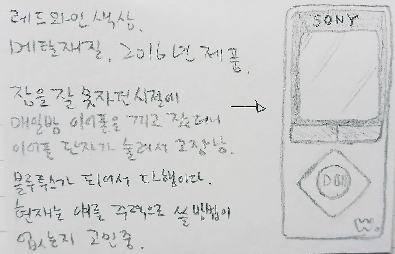 가끔 생각나 서랍 속에 있는 작은 워크맨을 꺼내본다. 배터리가 없어 눈뜰 수 없다고 외치는 화면은 다시 어두워진다. 그리고 나는 듣지도 않을 기기를 위해 충전기를 연결한다. 마치 아직 널 포기하지 않았다고 은근히 알려주듯이 말이다.