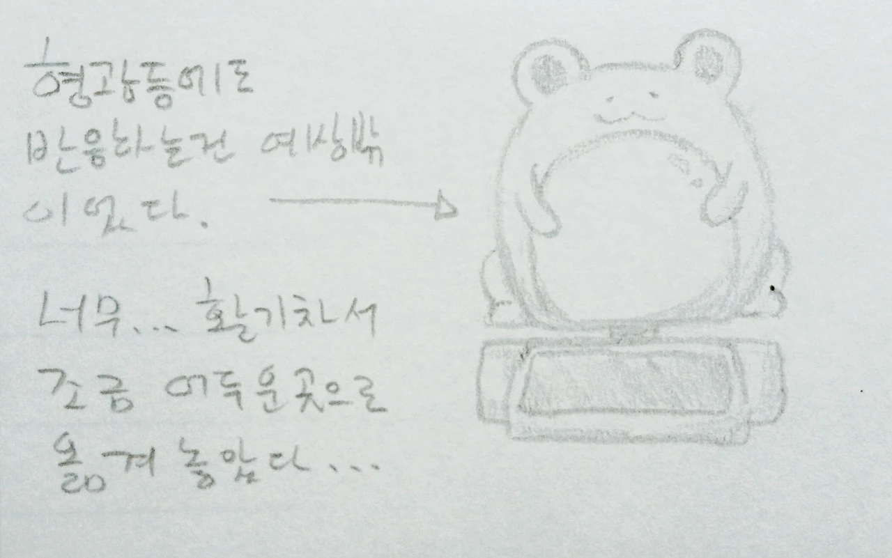 이 천 원짜리 개구리는 예상보다 시끄러웠다. 관절이 부서질 정도로 좌우로 머리를 흔드는 모습을 보니, 태평하다기보다는 볕이 뜨거우니 살려달라는 것처럼 보였다.