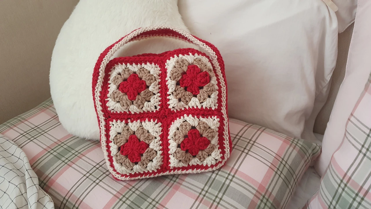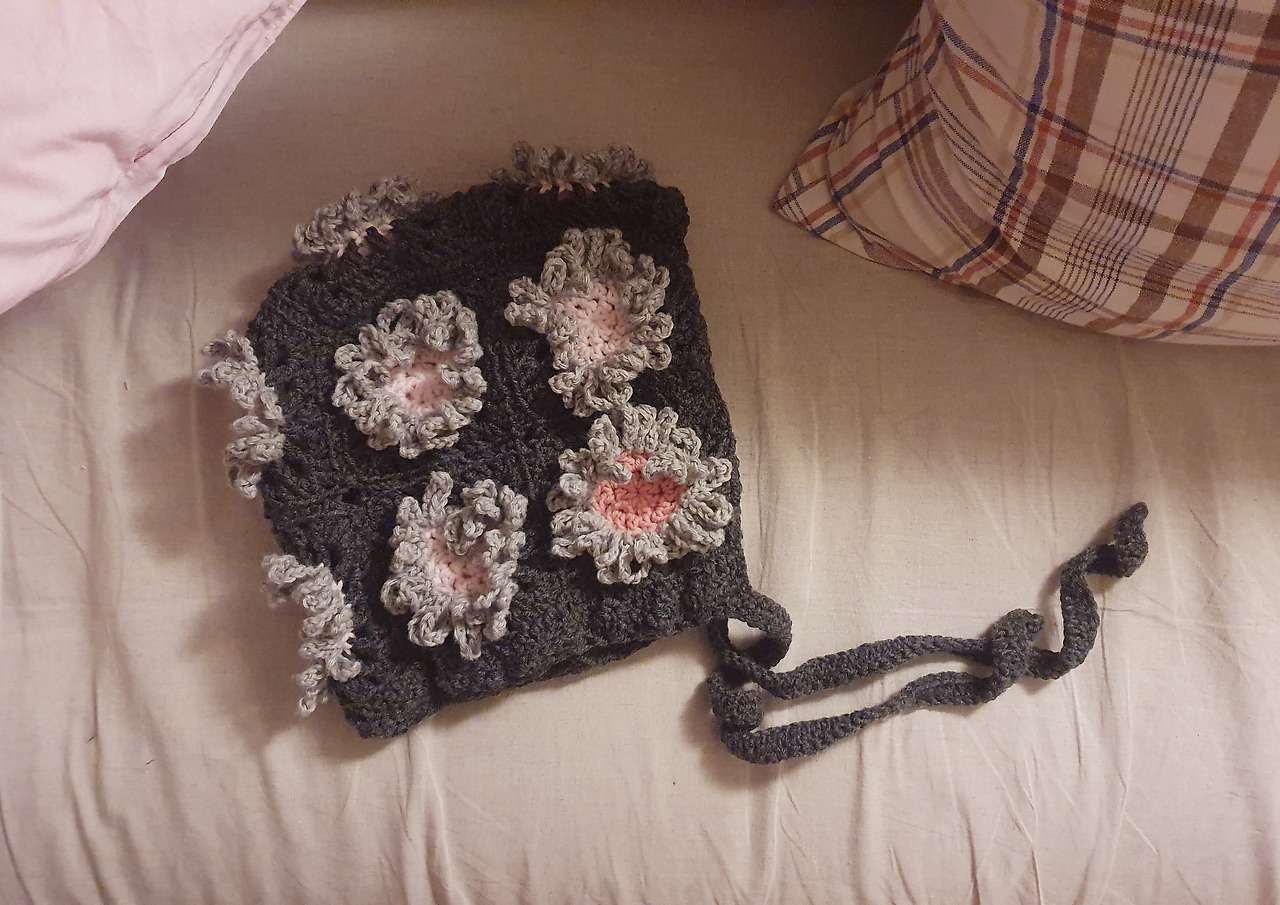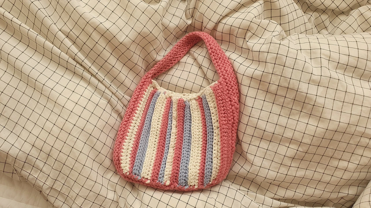 남은 실 처리하고자 뜬 가방. 도안도 계획도 없이 멋대로 떴다. 강아지 산책 가방으로 유용하게 쓰고 있다.