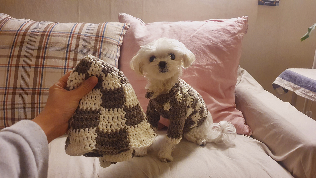체크 버섯 생산 후 실이 남아 강아지 옷도 떴다. 커플로 장착하고 산책하면 기분이 참 좋다.
