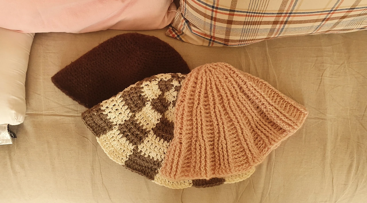 작년에 모자를 뜨고 남은 모헤어 실로 제일 왼쪽 버섯(버킷햇)을 생산했다. 다음엔 남자친구 목도리를 뜨고 남은 실로 체크무늬 버섯을, 다음엔 부드러운 메리노울 실로 핑크 버섯을 만들었다.